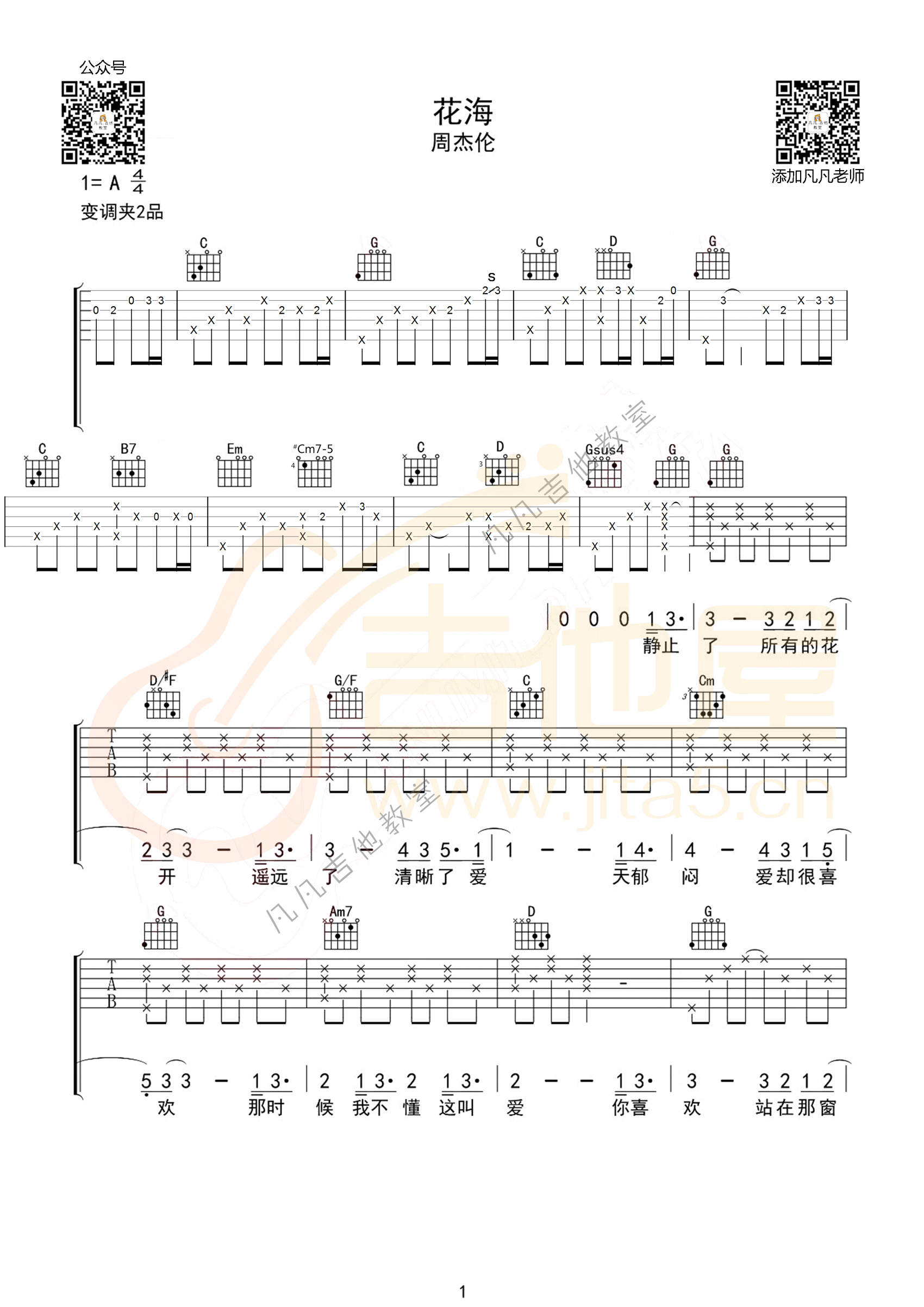 曲谱介绍: 花海吉他谱_周杰伦_《花海》G调弹唱六线谱_高清图片谱分享,《花海》是由周杰伦作曲并演唱的一首歌曲,这首歌的开头悠扬婉转的曲调,很像爱情里的忽冷忽热,琢磨不透。 吉他弹唱演示及视频教学