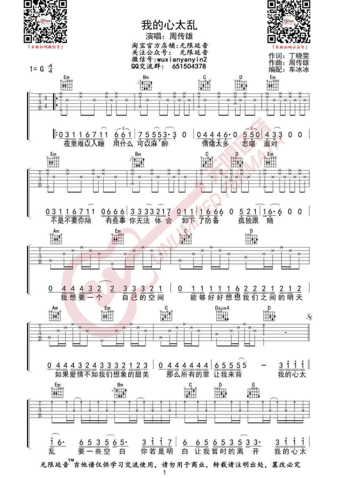 曲谱介绍: 《我的心太乱》吉他谱_周传雄_G调弹唱六线_高清图片谱分享,《我的心太乱》是由周传雄作曲并演唱的一首歌,也是周传雄的经典代表作。男人,也会脆弱,也会无助,也会流泪,这并不我脸也不需掩饰。我甚至鼓励现在的男人应该尽情让自己的情绪表现出来,因为只有先勇于面对自己,才能面对别人,我相信最真实的情感流露,一定最动人。简而言之,言而简之,这首歌就是“小刚”和“周传雄”的综合体。
