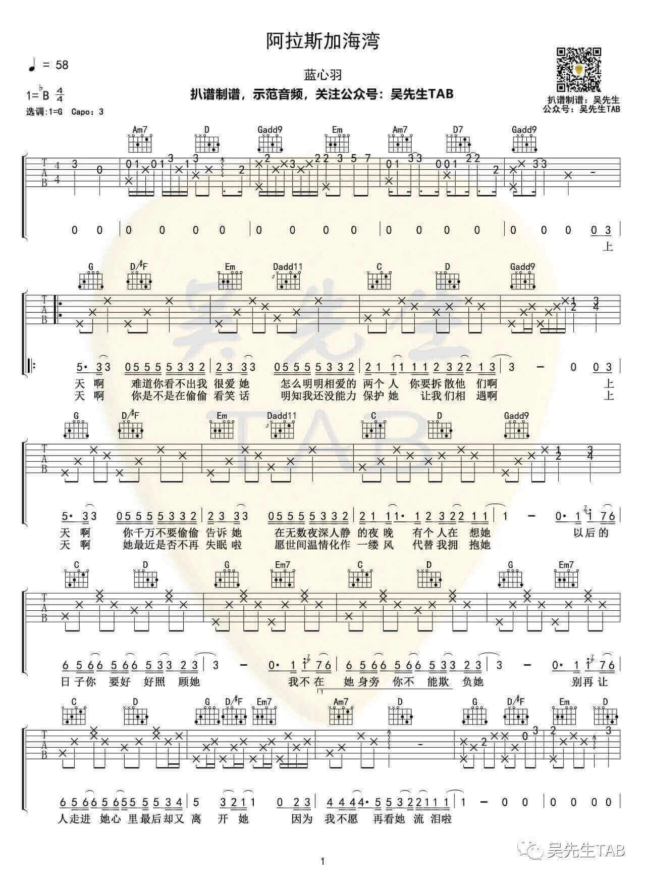 曲谱介绍: 《阿拉斯加海湾》吉他谱_蓝心羽_G调弹唱六线谱_高清图片谱分享,《阿拉斯加海湾》是由菲道尔和李康宁作词,菲道尔作曲并演唱的一首歌,蓝心羽演唱的版本也是十分动听。