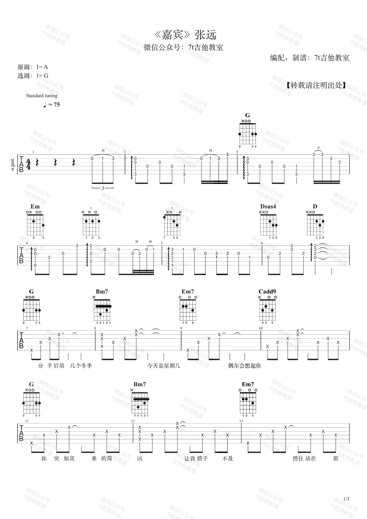 曲谱介绍: 嘉宾吉他谱_张远_《嘉宾》G调弹唱六线谱_高清图片谱分享,《嘉宾》是由张远演唱的一首歌,张远用具有宽度和高度的声音诠释了爱情的苦涩。这份爱情在歌曲中缓缓道来,仿佛诉说着我们内心的伤感。歌曲延用了张远宽而有深度声音,让这首悲伤情歌少了无病呻吟,多了情真意切。钢琴作为整首曲子的主乐器,贯穿了歌曲始终,与张远音色完美融合,更增添了这首歌的别样魅力。 吉他弹唱演示及视频教学