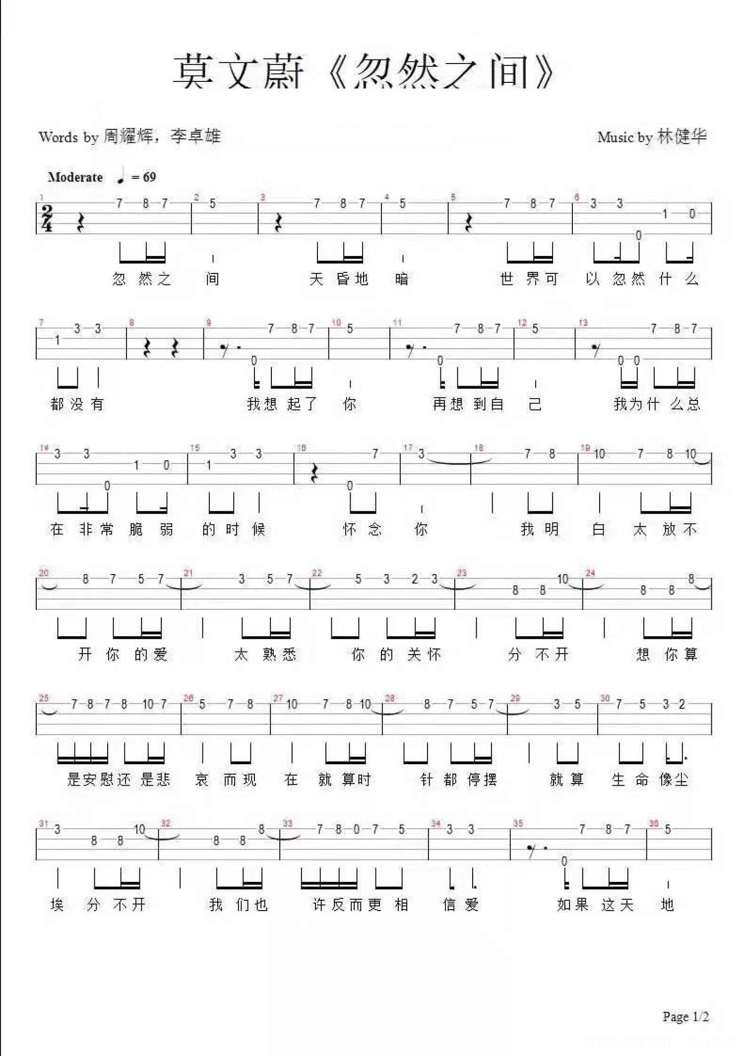 曲谱介绍: 莫文蔚《忽然之间》_C调尤克里里谱