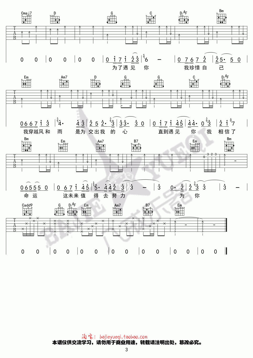 曲谱介绍: 薛之谦《为了遇见你》吉他弹唱谱,采用G调指法编配,共有3张高清图谱。