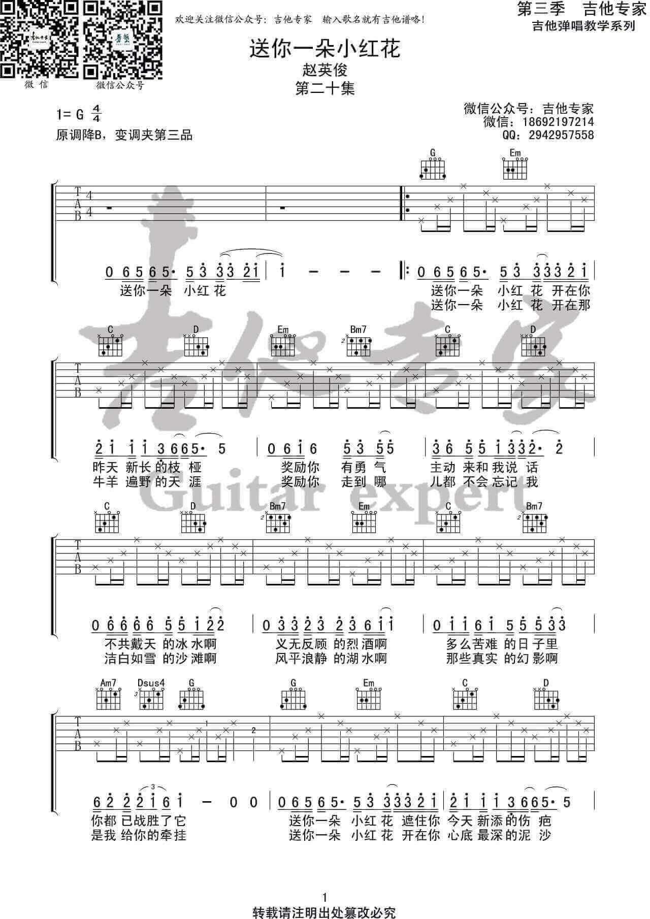 曲谱介绍: 《送你一朵小红花》吉他谱_赵英俊_G调弹唱谱_高清六线谱分享,歌曲《送你一朵小红花》是由赵英俊作词作曲并演唱的同名电影主题曲,在赵英俊深情的声线中,每一句歌词都是一段故事。影片围绕两个抗癌家庭的两组生活轨迹,讲述了一个温情的现实故事,思考和直面了每一个普通人都会面临的人生命题。歌曲很好听,朗朗上口, 云淡风轻的口吻,不服输于命运的人称视角,又充满着人间温暖。高潮部分,乐器的明朗,歌手深情嗓音配合, 恰当好处,真实的、感人的,将牵挂和祝福娓娓道来。