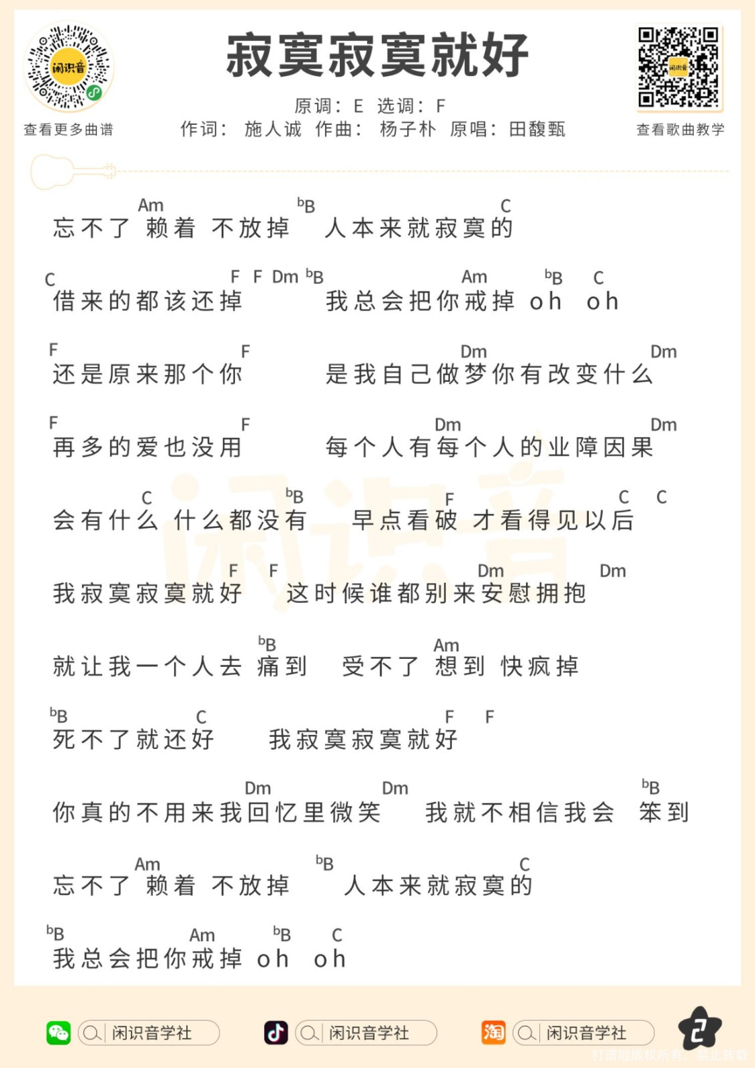 曲谱介绍: 田馥甄《寂寞寂寞就好》_F调尤克里里谱