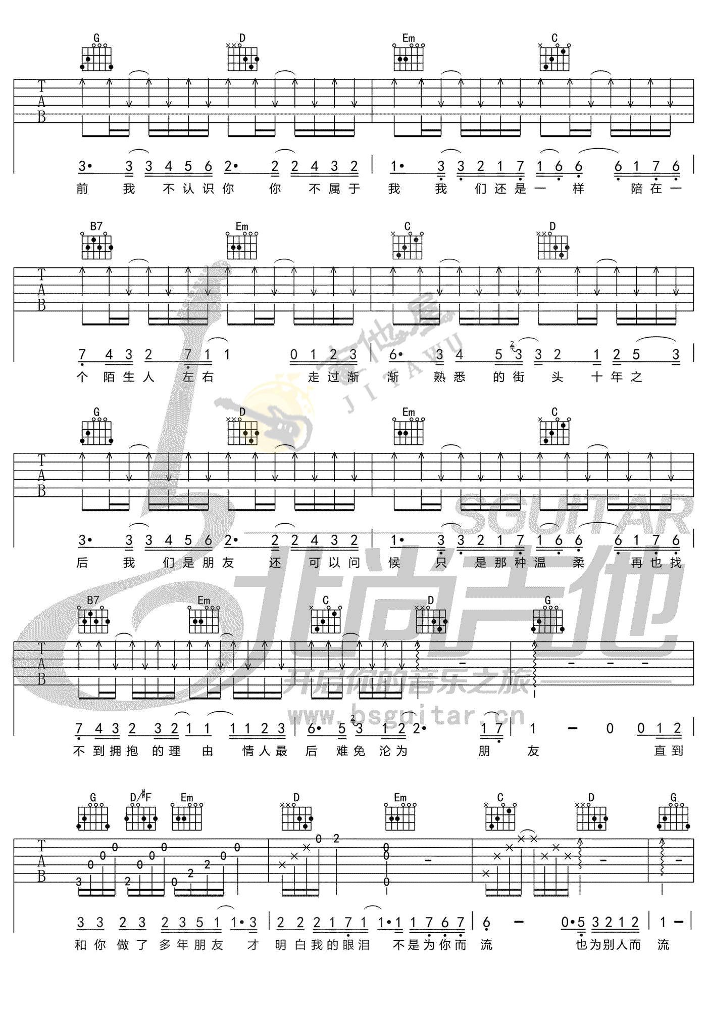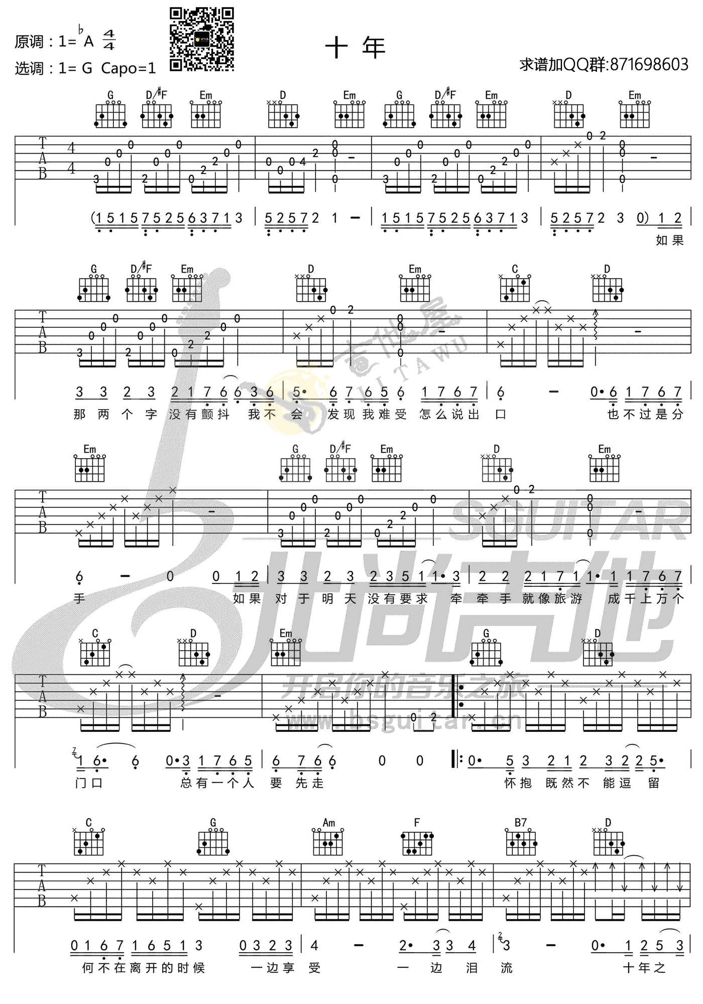 曲谱介绍: 陈奕迅《十年》Eason简单版G调弹唱吉他谱_高清图片谱分享,每次听到陈奕迅这首《十年》的旋律和歌词,无论是有没有故事的人,都会有一种莫名的感触,此版本为G调的曲谱,和网络上其他G调版本的曲谱不同,这个版本指法已经经过简化,所以弹奏起来并不难,十分适合初学者们学习! 陈奕迅《十年》Eason简单版G调弹唱吉他谱_高清图片谱1: