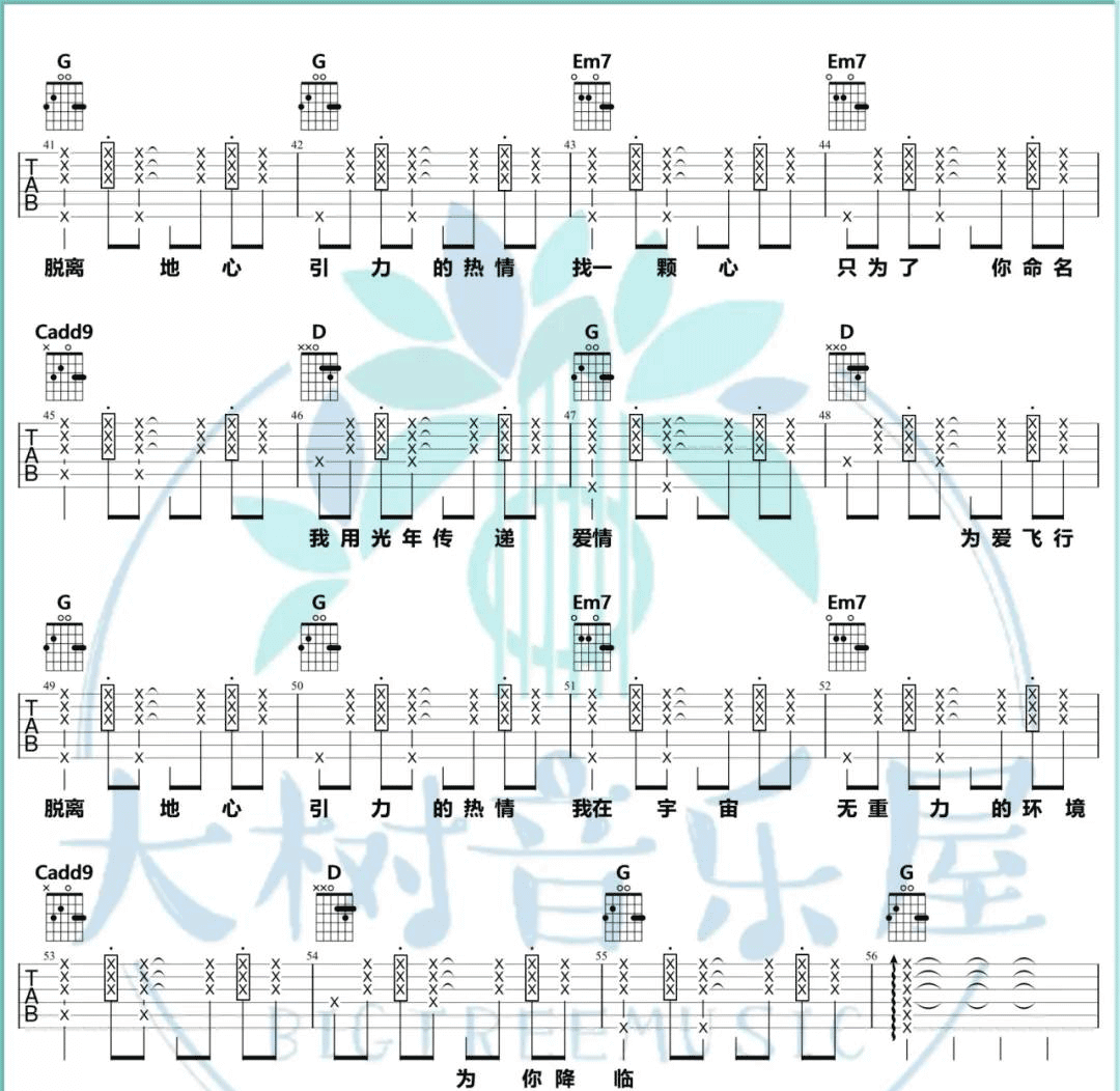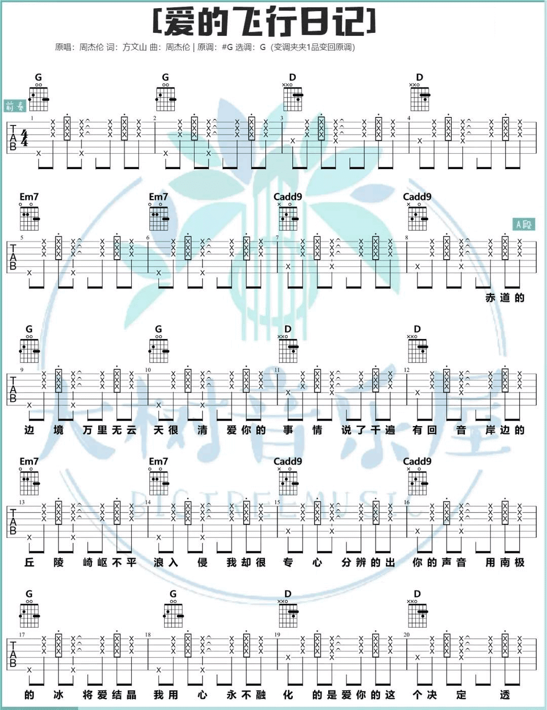 曲谱介绍: 《爱的飞行日记》吉他谱_周杰伦_G调简单版弹唱谱_高清六线谱分享,《爱的飞行日记》是由周杰伦创作并演唱的一首抒情摇滚风格歌曲。轻快的抒情摇滚,与Gary合作,可以说融入了部分Gary《月光》这张专辑的特点,歌词温馨甜蜜,让人感觉到爱情的美好和幸福! 此版本的曲谱来源于大树音乐屋扒谱制谱,歌曲原调为#G调,这里采用了G调指法进行编配,演唱时夹变调夹1品回到原调。这首歌编配整体难度不大,全曲采用“根音 勾 拍弦 勾 空勾 拍弦 勾”的节奏型,非常简单。 《爱的飞行日记》吉他谱_周杰伦_G调简单版弹唱谱_高清六线谱1:
