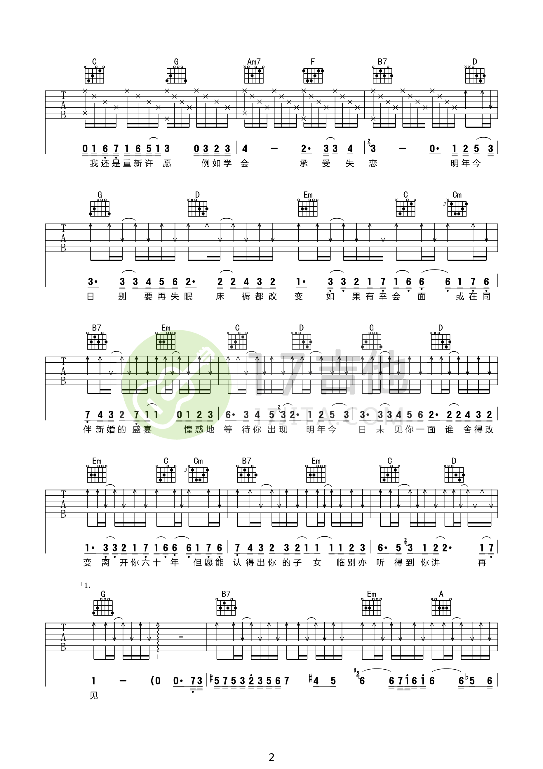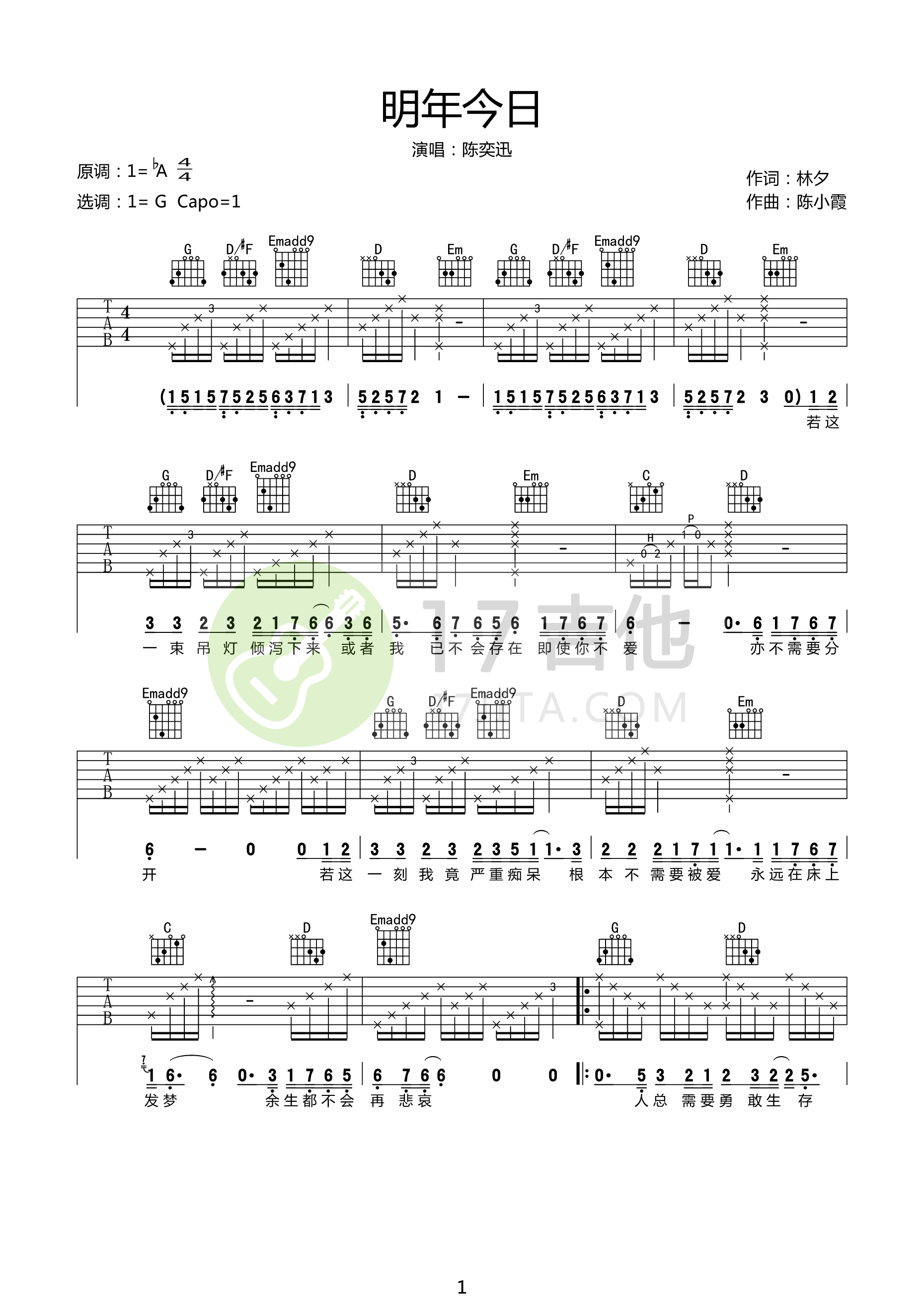 曲谱介绍: 明年今日吉他谱_陈奕迅_《十年》G调原版弹唱谱_高清六线谱分享,《明年今日》是由陈奕迅演唱的一首粤语歌曲,同时也是电影《贱精先生》的插曲,《明年今日》的国语版是《十年》。这首歌的歌词意境是悲苦的,讲述一个人离开恋人之后过得生不如死,情愿躺在床上等天花板的吊灯将自己砸成痴呆,那么就可以永远不再悲哀的苦况;副歌更是用“离开你六十年,但愿能认得出你的子女“来写出一阙人间的苦情大惨剧。