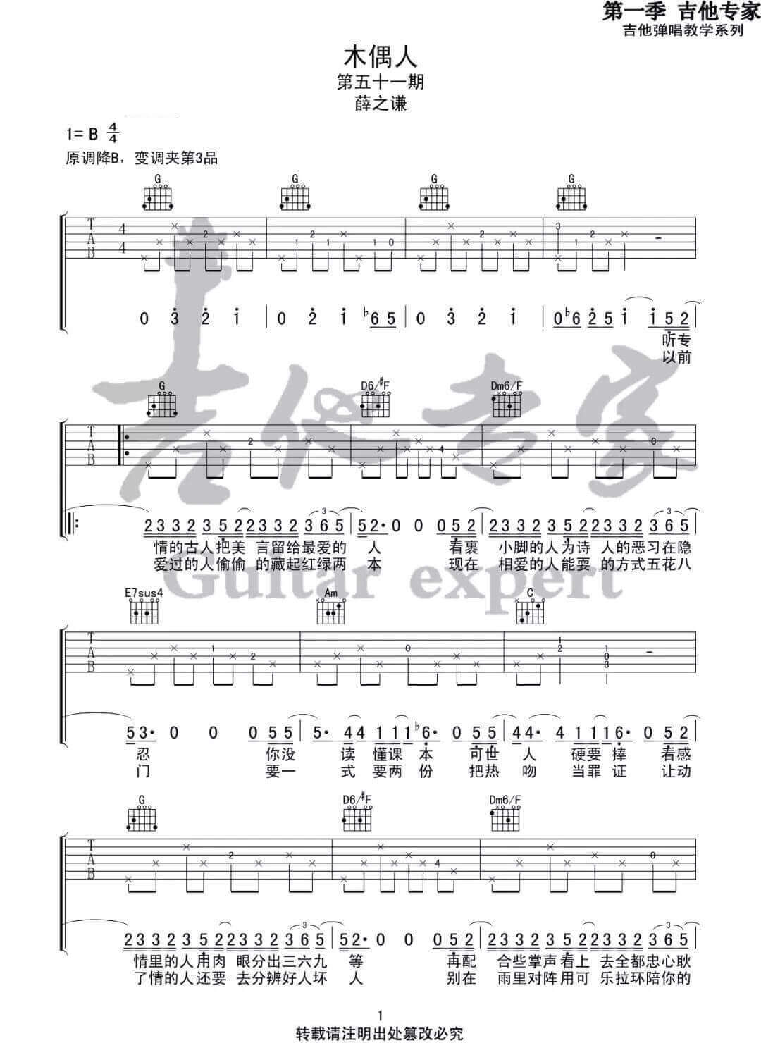 曲谱介绍: 木偶人吉他谱_薛之谦_《木偶人》G调原版弹唱谱_高清六线谱分享,《木偶人》这首歌是薛之谦的最新单曲,薛式情歌自带光环,编曲确实很好,变音递进很有味道,主歌到副歌部分有转调。歌曲不好弹也不好唱,改变为吉他谱有删减了不少东西。 此版本的曲谱来源于音艺吉他扒谱制谱,歌曲原调为降B调,这里采用G调指法根据原版进行编配,演唱时夹变调夹3品回到原调。这首歌难度主要在于几个和弦的熟练转换其他部分像节奏、前奏等都比较简单。 木偶人吉他谱_薛之谦_《木偶人》G调原版弹唱谱_高清六线谱1-2: