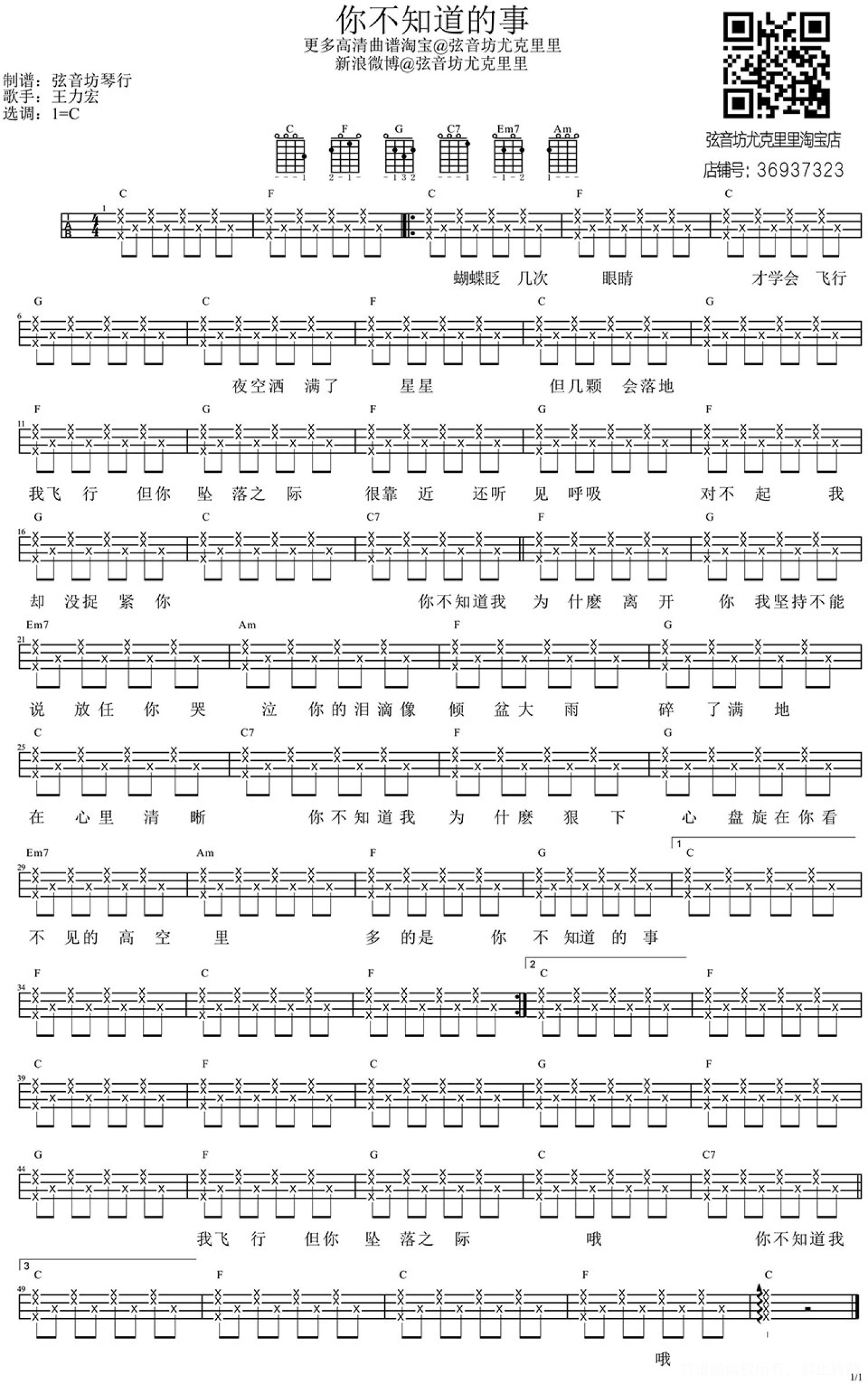 曲谱介绍: 王力宏《你不知道的事》_C调尤克里里谱