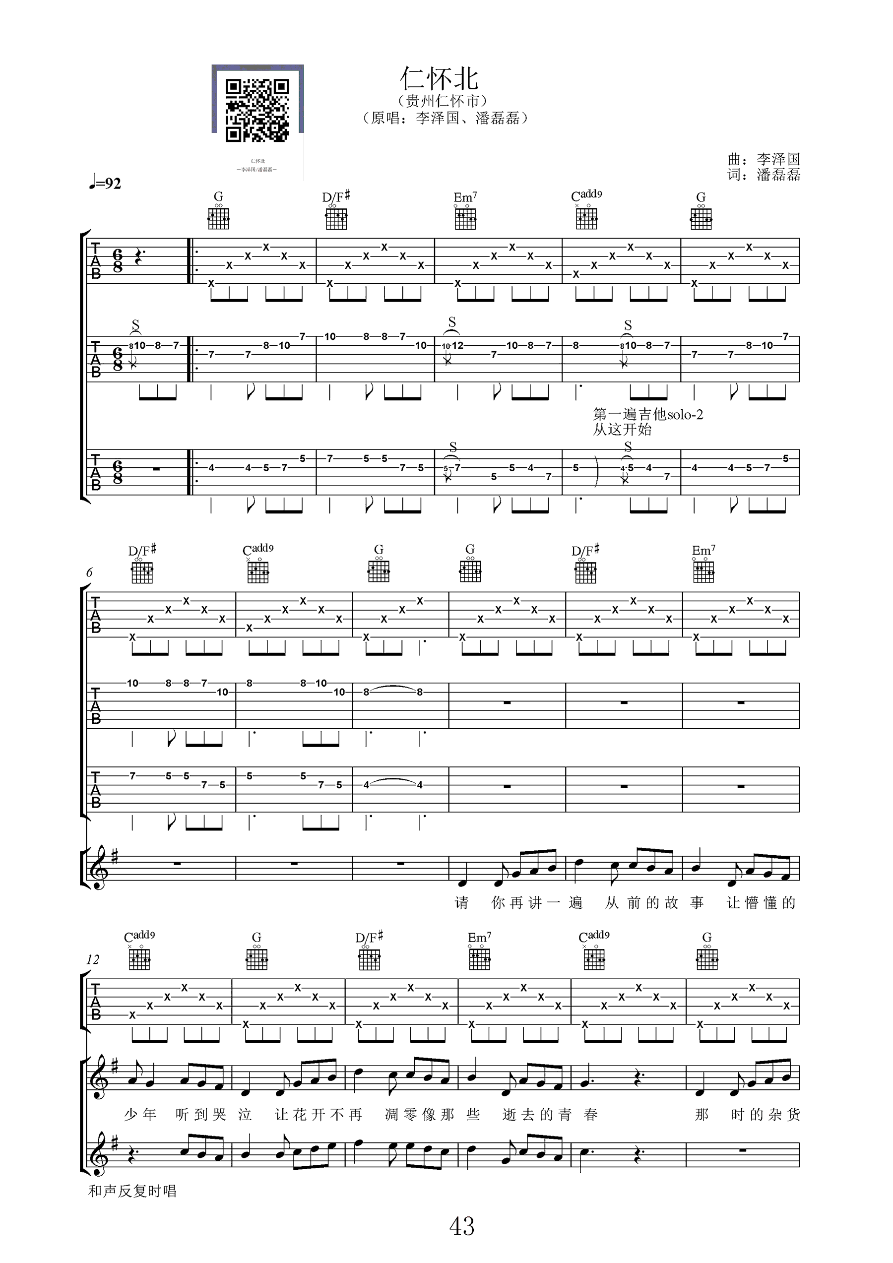仁怀北吉他谱 - 李泽国/潘磊磊 - G调吉他弹唱谱 - 原版