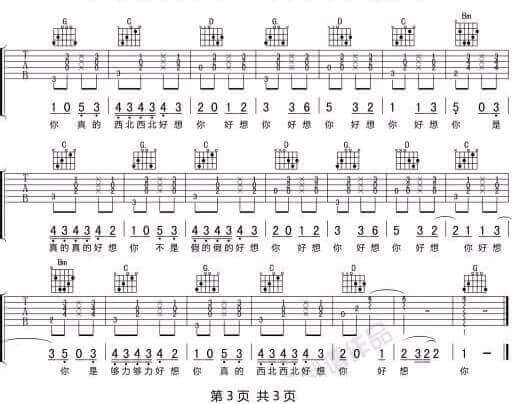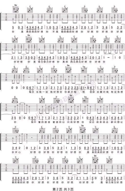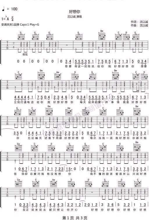 曲谱介绍: 《好想你》吉他谱_沈以诚_G调弹唱谱_好想你六线谱_高清图片谱分享,《好想你》这首歌原本为马来西亚的萌妹朱主爱四叶草创作并演唱的一首歌曲,后沈以诚翻唱,唱出了这首歌不一样的味道。 此版本的曲谱来源于网络分享,歌曲原调为降A调,这里采用G调指法根据沈以诚演唱的原版进行编配,演唱时变调夹夹1品即可回原调。 《好想你》吉他谱_沈以诚_G调弹唱谱_好想你六线谱_高清图片谱1: