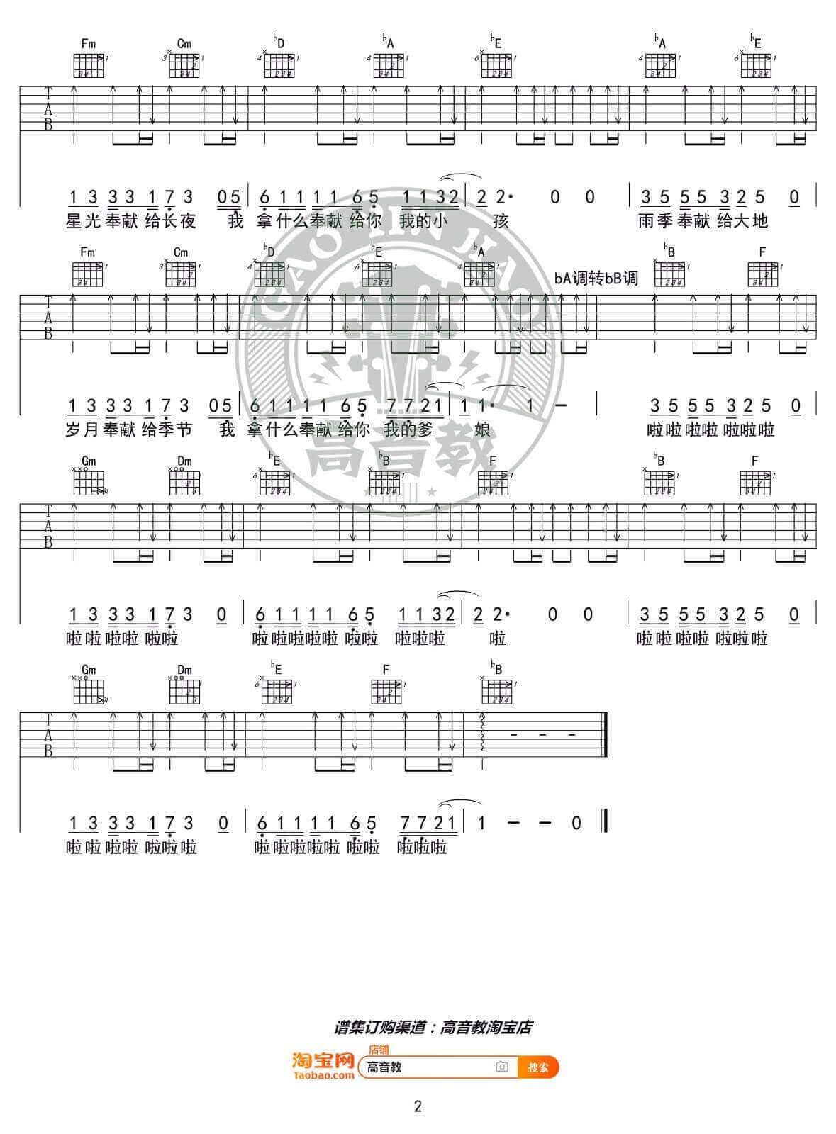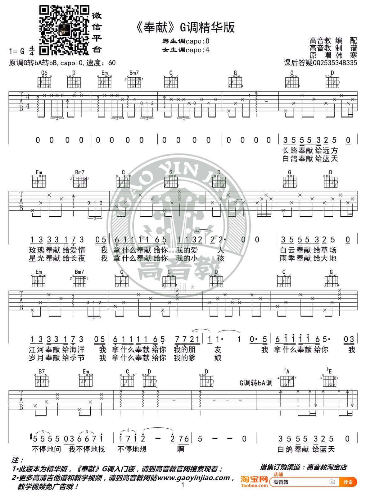 曲谱介绍: 《奉献》吉他谱_韩寒G调原版_弹唱吉他六线谱_飞驰人生片尾曲分享,今年春节期间电影档实在是火热,这首由韩寒演唱的电影《飞驰人生》的片尾曲也是吸引了不少人去听,此版本采用G调指法编配,其中含有较多技巧和单音,还有切分节奏需要多注意一下,最后还有一个G转降B调。 《奉献》吉他谱_韩寒G调原版_弹唱吉他六线谱_飞驰人生片尾曲1: