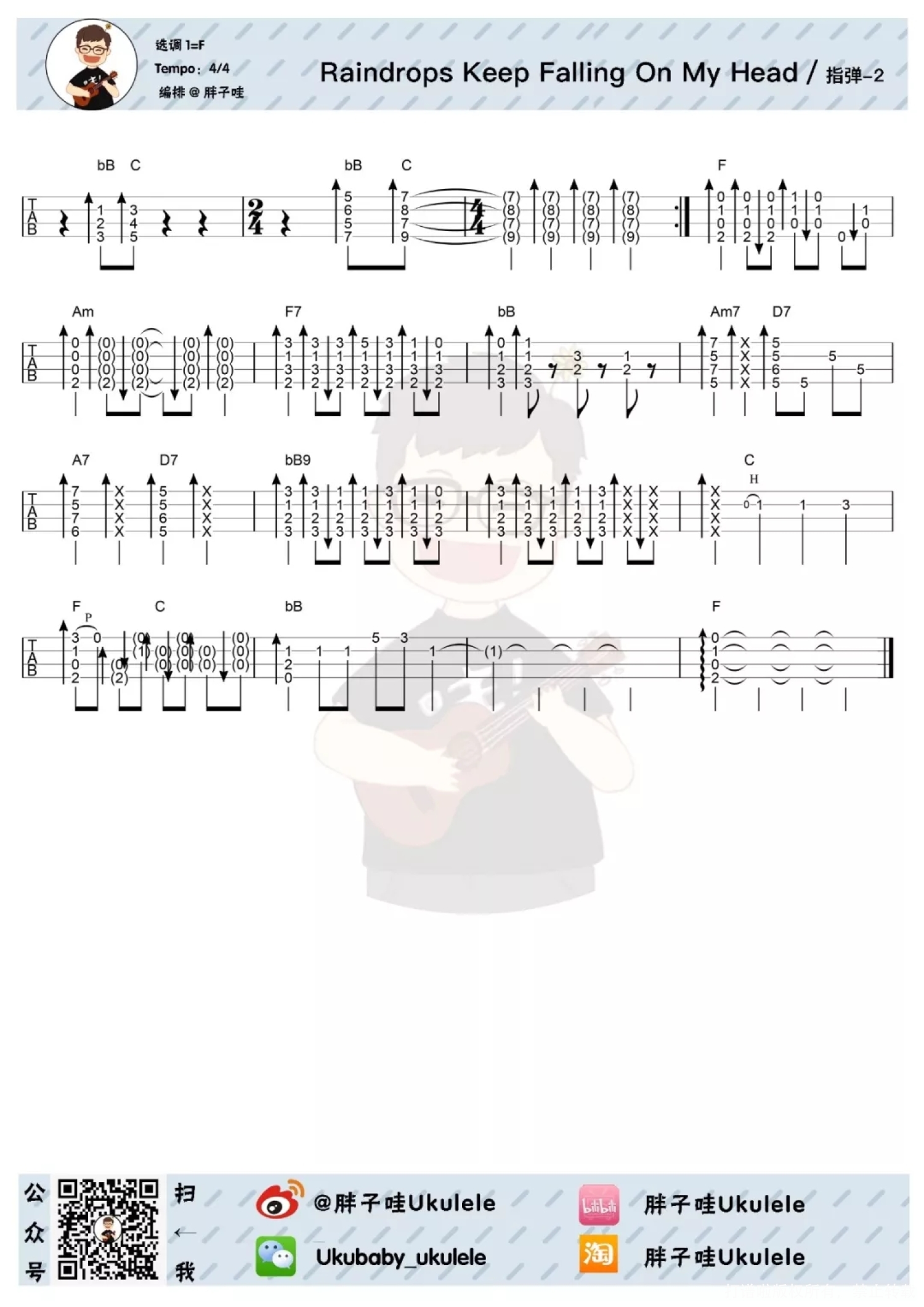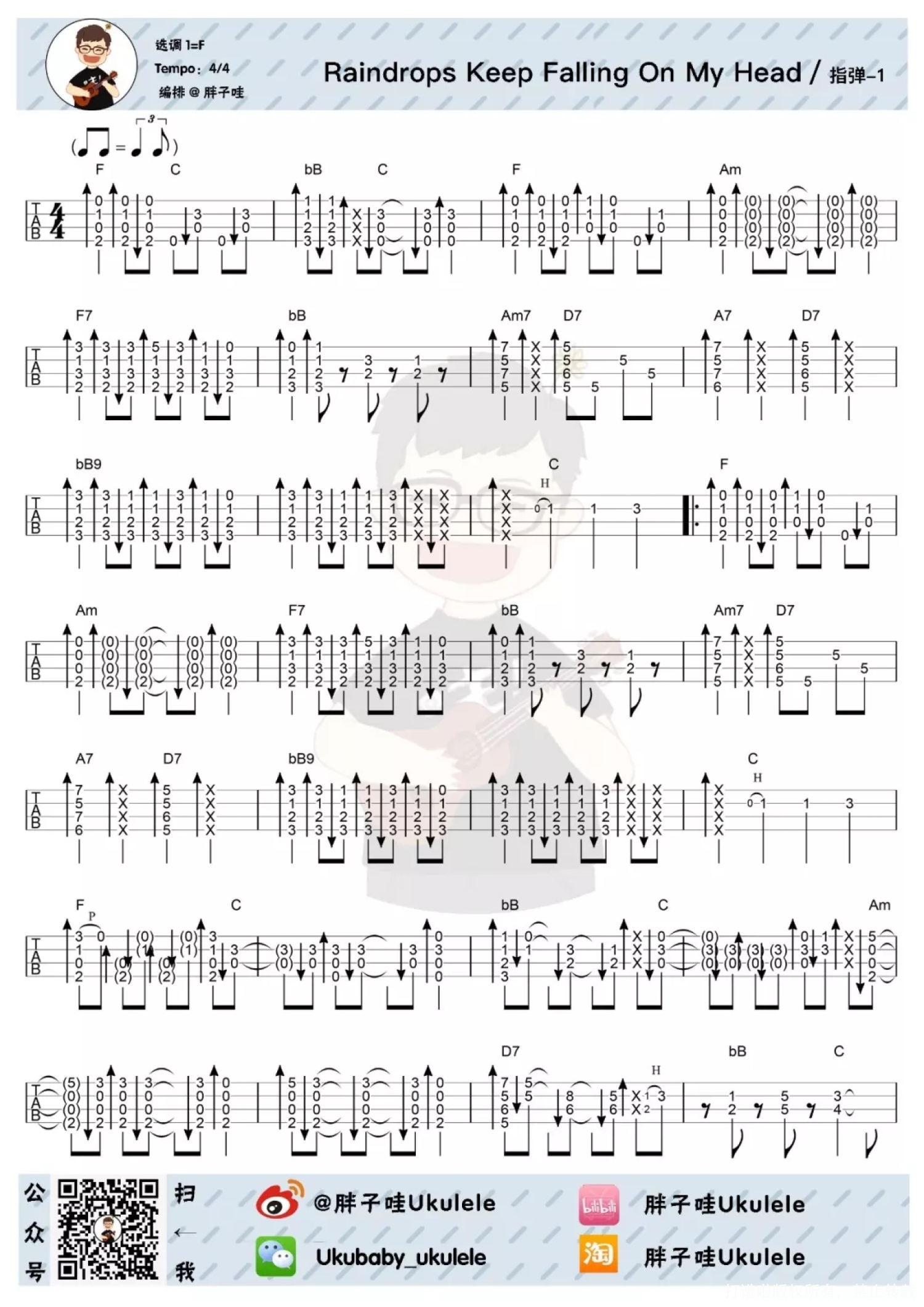 曲谱介绍: 经典曲目,《蜘蛛侠》、《阿甘正传》等背景音乐。王若琳翻唱。RaindropsKeepFallingOnMyHead/Ukulele指弹Cover《RaindropsKeepFallingOnMyHead》翻唱的人不计其数,是流行音乐史上令人难忘的经典。节奏轻松明快,旋律动人,是阴雨连绵天气里的治愈良方RaindropsKeepFallingOnMyHeadukulele指弹谱Raindropskeepfallingonmyheadukulele弹唱谱右手弹奏建议:谱上已标注,d=down u=up,也就是  下-下上下-下上。大写的D=重音。