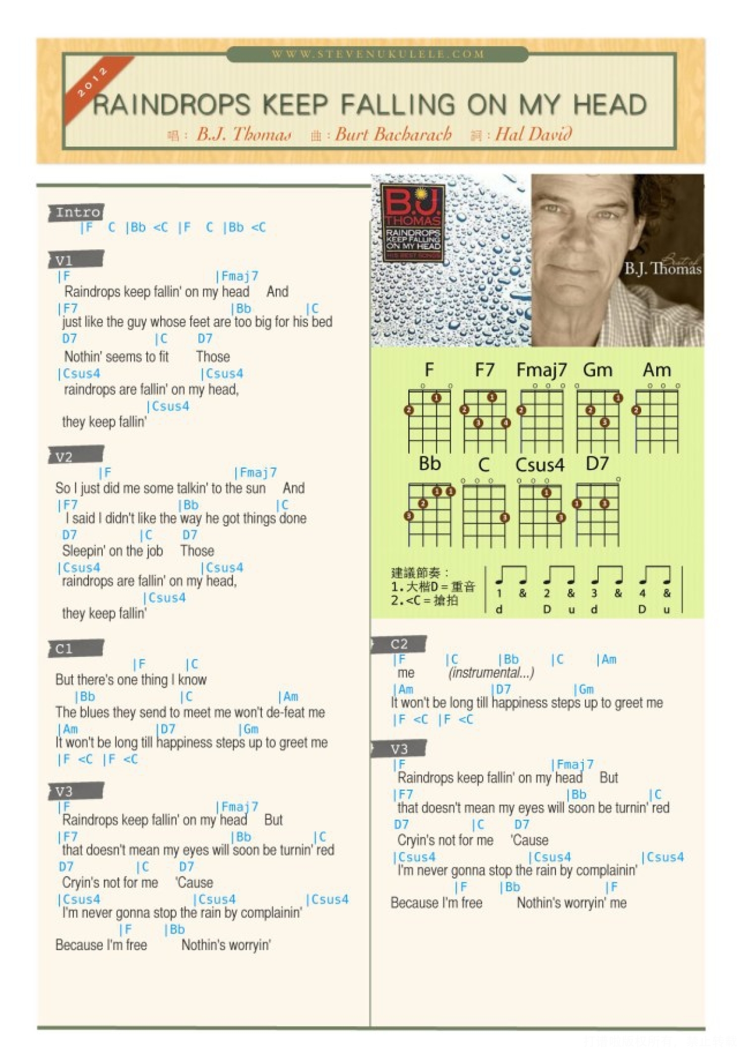 Raindrops keep falling on my head尤克里里谱 - B.J.Thomas
