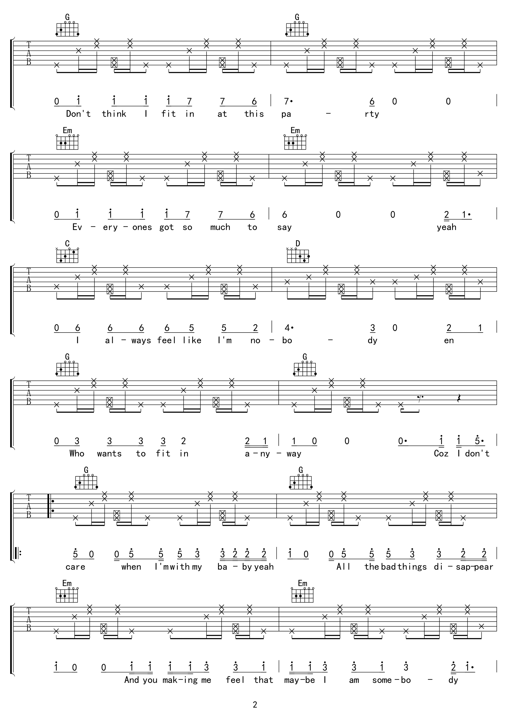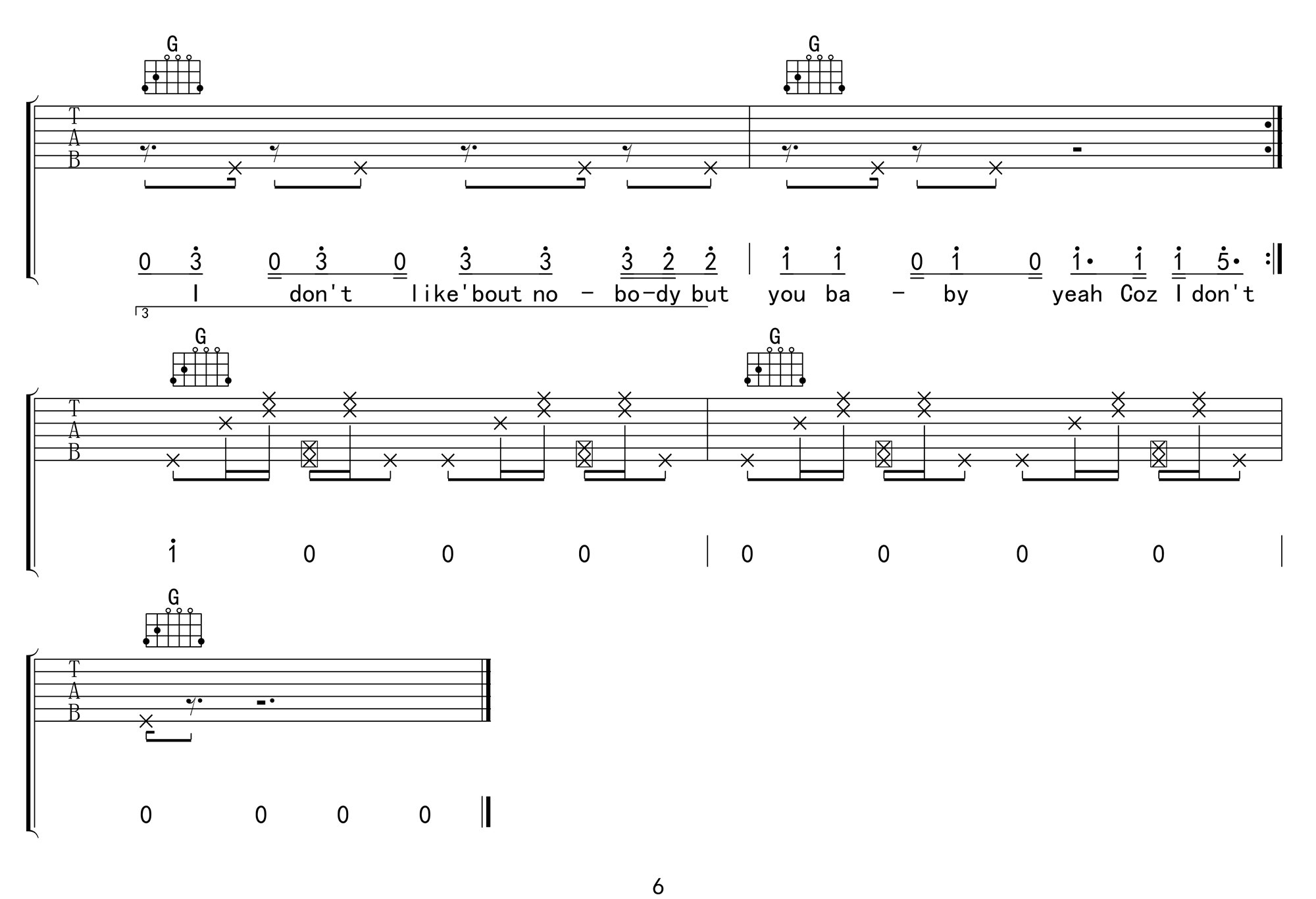 曲谱介绍: 《I Don't Care》吉他谱_贾斯汀比伯/艾德希兰_G调弹唱六线谱分享,《I Don't Care》这首歌是由贾斯汀比伯和艾德希兰合作完成,歌里虽然说着“我不在乎”,但歌词却充满爱情的甜蜜。当一个人遇到真爱,有爱的人在身边,不论身处什么环境“我都不在乎”。 此版本的曲谱来源于吴先生扒谱制谱,歌曲原调为#F调,这里采用G调指法根据原版进行编配,演唱时需要降半音调弦。虽然谱子篇幅较长,但其实是很简单的,节奏型非常单一,用到了拍弦的技巧,和弦也比较简单。 《I Don't Care》吉他谱_贾斯汀比伯/艾德希兰_G调弹唱六线谱1-3: