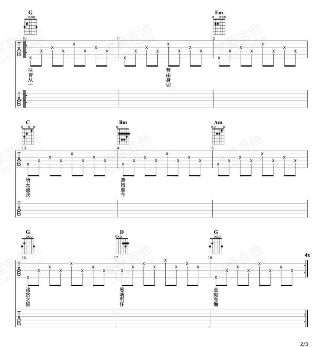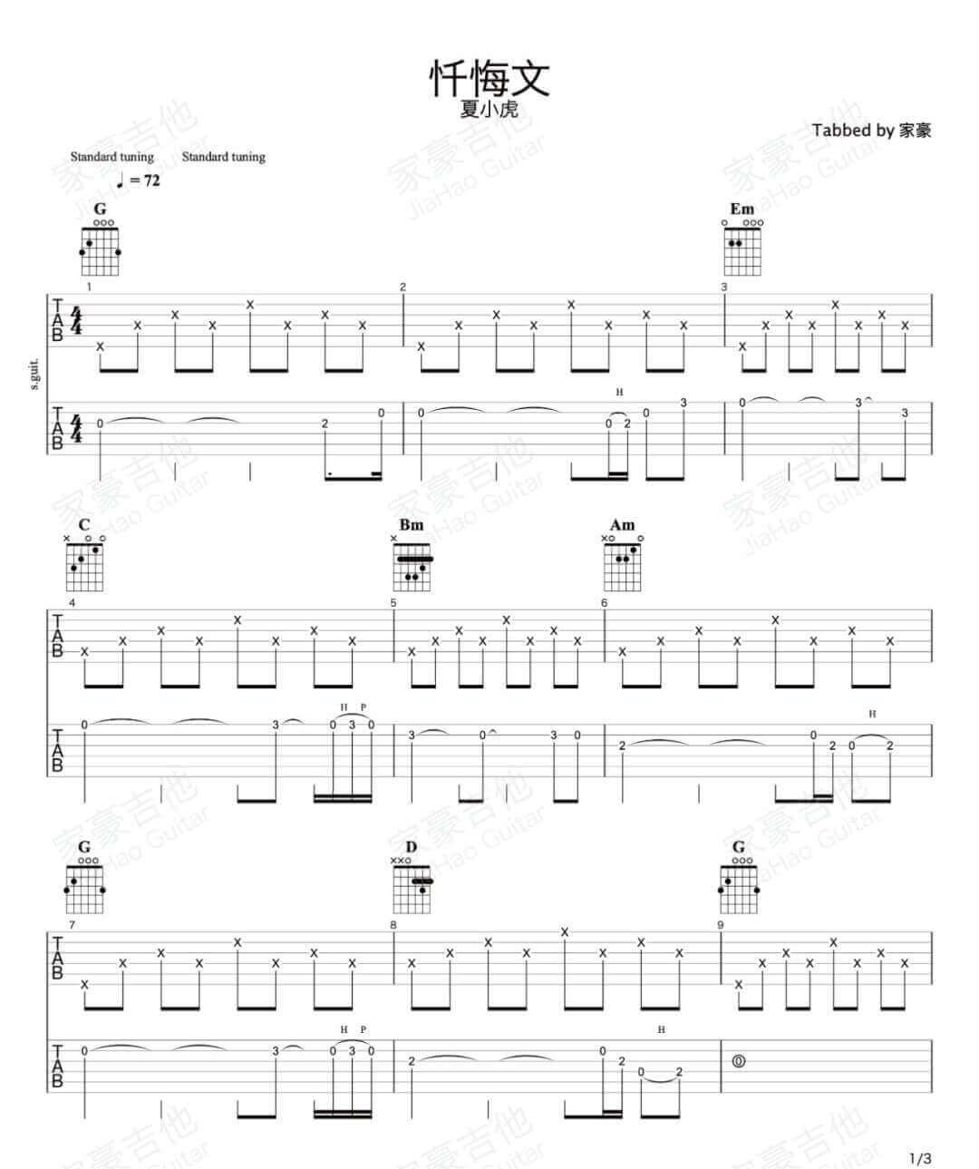 曲谱介绍: 《忏悔文》吉他谱_夏小虎_G调双吉他版弹唱六线谱_高清图片谱分享,《忏悔文》是由夏小虎创作并演唱的一首民谣歌曲。 此版本的曲谱来源于家豪吉他扒谱制谱,歌曲采用G调指法根据原版进行编配。这是一个双吉他版本的谱子,一共有两个音轨,下面一轨弹solo旋律,上面一轨弹伴奏节奏,如果没有小伙伴,只弹上面一轨即可。 《忏悔文》吉他谱_夏小虎_G调双吉他版弹唱六线谱_高清图片谱1: