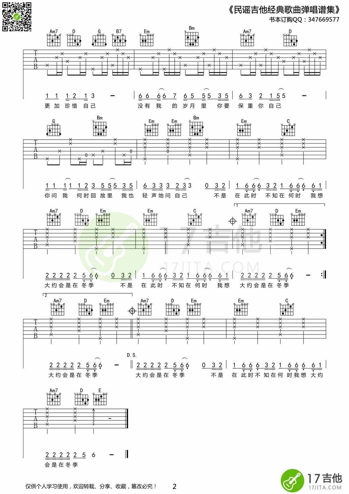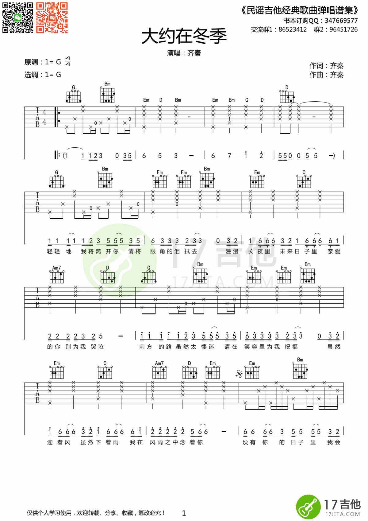曲谱介绍: 齐秦《大约在冬季》吉他弹唱谱,采用G调指法编配,共有2张高清图谱,免翻页排版设计。