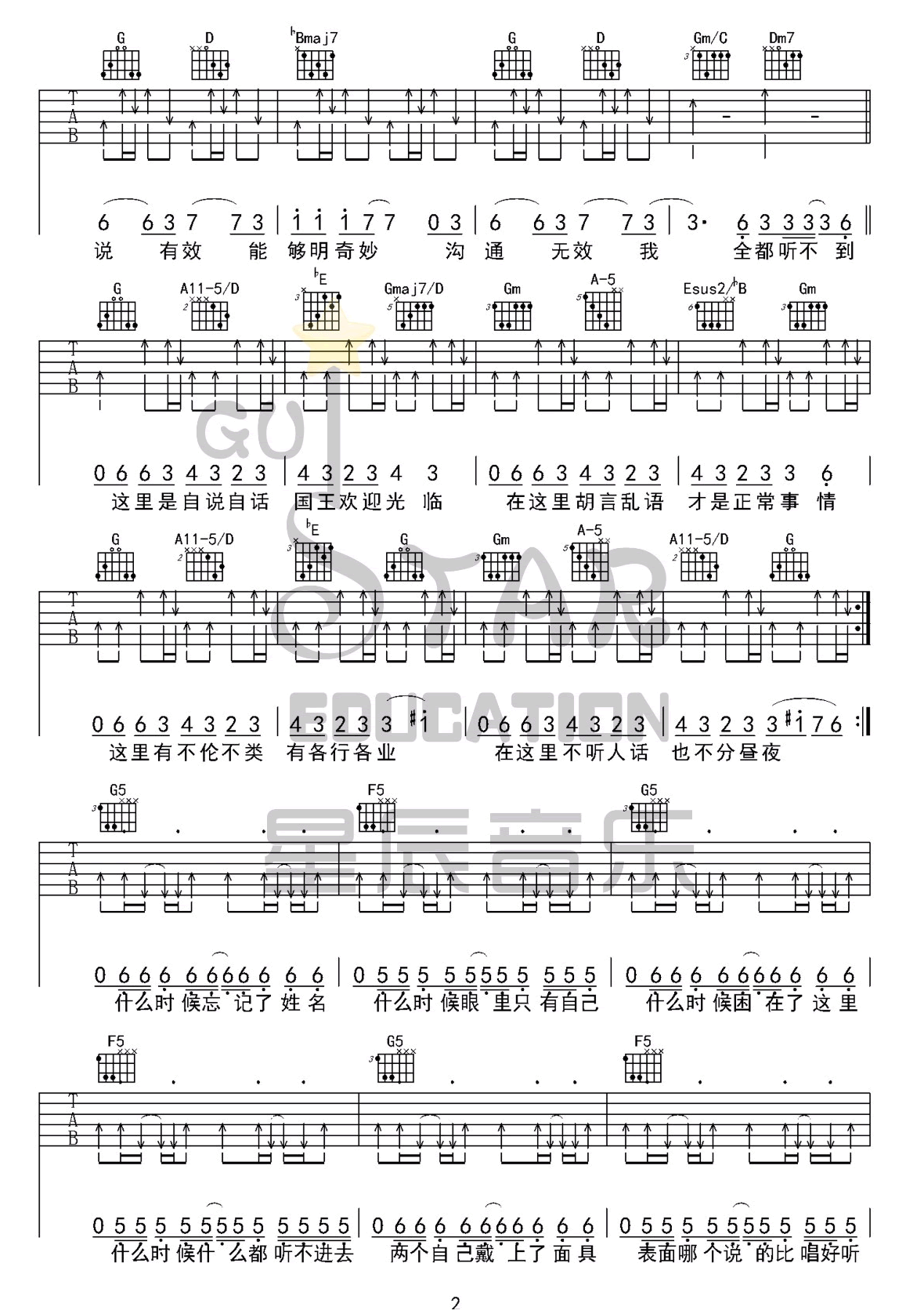曲谱介绍: 《巴别塔庆典》吉他谱_吴青峰_G调原版弹唱谱_高清六线谱分享,《巴别塔庆典》是由吴青峰作词作曲并演唱的一首歌曲,今年七月份刚刚发行。歌词继续了“巴比塔”寓意的抽象,光看歌词“你可能觉得荒诞,可能觉得莫名,但是如果了解了巴别塔的故事,也就明白了这歌词背后,实际上完成了吴青峰从音乐到哲学的穿透表达。 此版本的曲谱来源于星辰音乐扒谱制谱,高清原调为降B调,这里采用G调指法根据原版进行编配,演唱时夹变调夹3品回到原调。前面以几个泛音开头,后面有些和弦的指法可能比较生僻和复杂,有一定难度。 《巴别塔庆典》吉他谱_吴青峰_G调原版弹唱谱_高清六线谱1:
