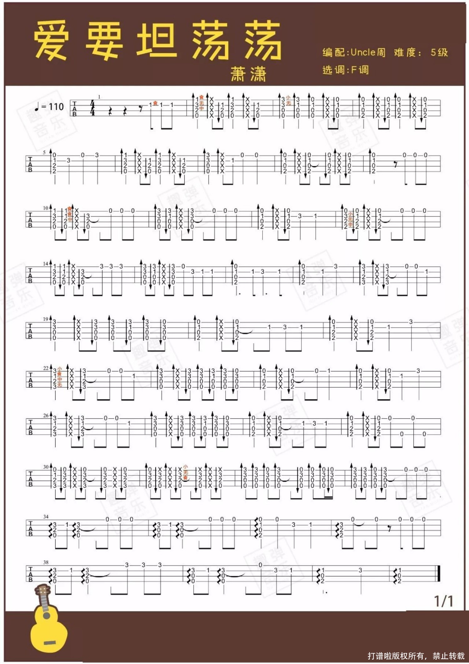 曲谱介绍: 萧潇《爱要坦荡荡》_F调尤克里里谱