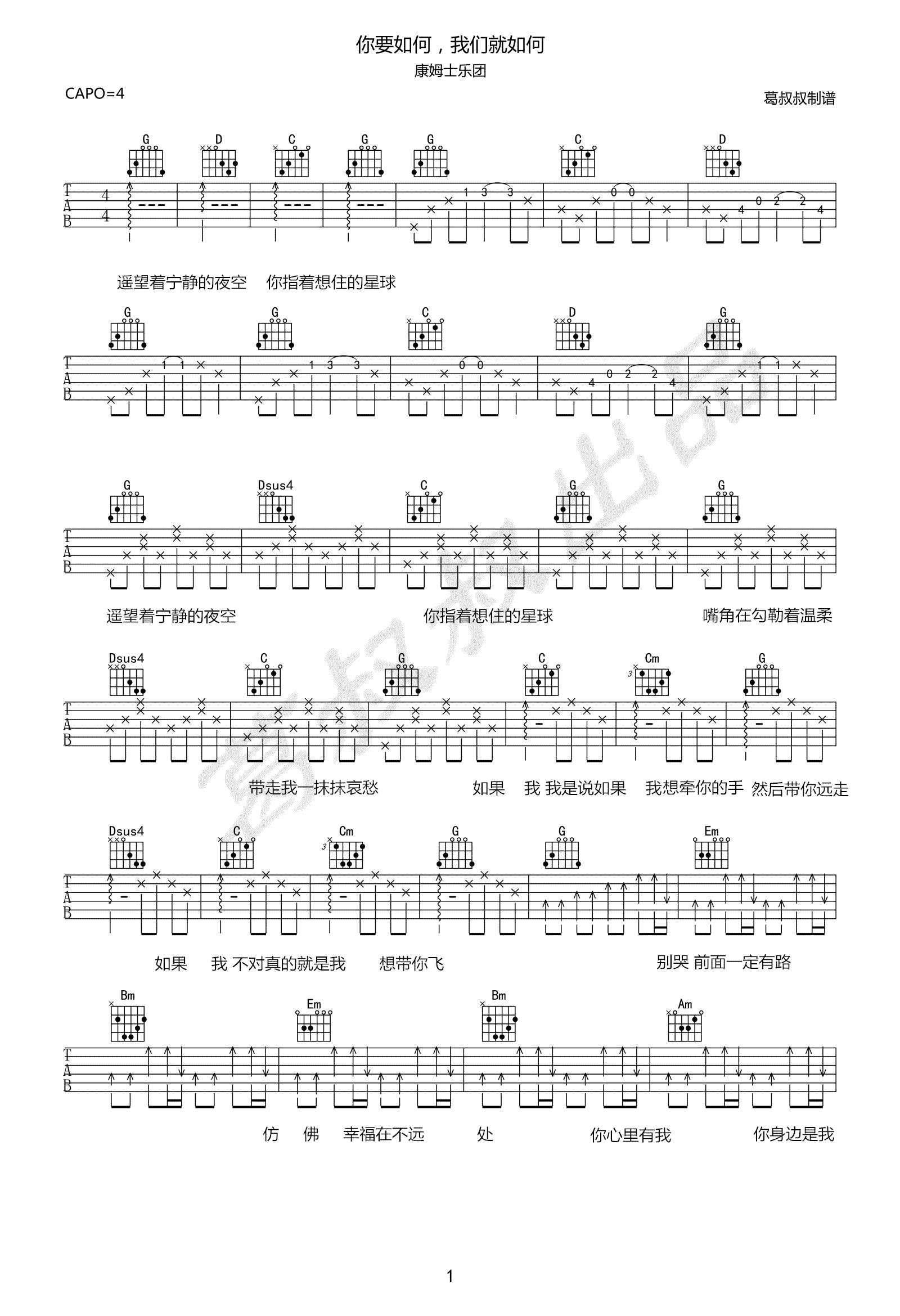 曲谱介绍: 《你要如何我们就如何》吉他谱_康姆士乐团_高清G调弹唱六线谱分享,《你要如何我们就如何》这首歌是康姆士乐团主唱永驻写给缅甸南渡的孩子们。
