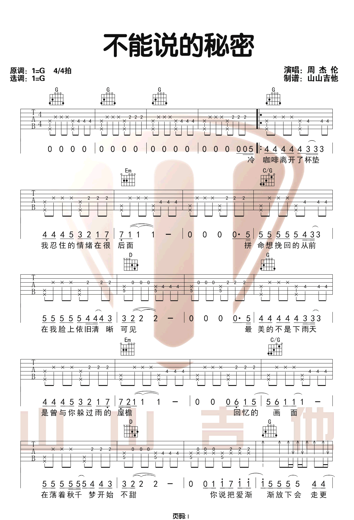 曲谱介绍: 《不能说的秘密》吉他谱_周杰伦_G调原版六线谱_吉他弹唱教学视频: 吉他弹唱演示及视频教学 《不能说的秘密》吉他谱_周杰伦_G调原版六线谱_吉他弹唱教学分享,《不能说的秘密》由周杰伦演唱,歌词旋律都是与电影很贴近。由方文山作词,周杰伦作曲,以英式摇滚曲风,带着一点悬疑色彩的爱情故事,歌曲每每响起时,都会想到当年看电影时候的那些情节和心情。 此版本的曲谱及教学来源于西二吉他(原山山吉他)出品,这里歌曲采用了G调指法根据原版进行编配,演唱时可根据自己的嗓音情况夹变调夹。这首歌编配难度不大,主旋律音贯穿全曲,非常接近原版,和弦及节奏型都十分简单,不懂可以参考视频练习。 《不能说的秘密》吉他谱_周杰伦_G调原版吉他弹唱六线谱_高清图片谱: