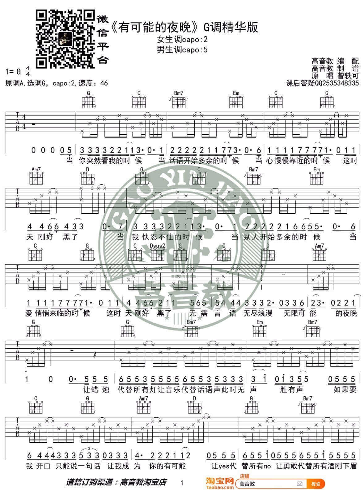 曲谱介绍: 有可能的夜晚吉他谱_曾轶可_《有可能的夜晚》六线谱_G调精华版分享,《有可能的夜晚》这首歌是由曾轶可在2013年凌晨时分发行的一首单曲,如果要我选择,只能爱一个人,让我成为你的有可能;如果要我开口,只能说一句话,让我成为你的有可能。此版本的曲谱来源于高音教团队,这首歌原调为A调,这里的曲谱采用G调指法编配,变调夹夹2品演唱。 有可能的夜晚吉他谱_曾轶可_《有可能的夜晚》六线谱_G调精华版1:
