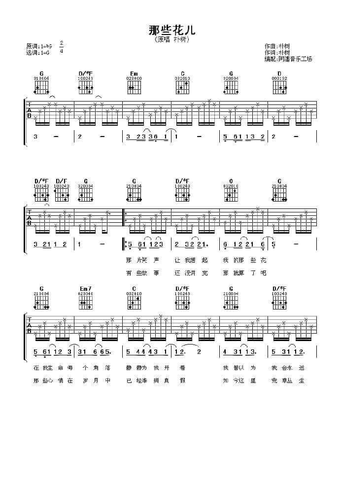 曲谱介绍: 朴树的每一首歌,都非常有故事,这首《那些花儿》小时候的我们并不懂歌里有什么含义,但是当我们渐渐长大,才发现那些曾经离我们那么近的人,如今都已不知在何方。 此版本为《那些花儿》G调原版吉他高清图片谱,采用G调指法标配,完美的还原了原曲的伴奏,追求原版的朋友,可以试试这个版本。 朴树《那些花儿》G调原版弹唱吉他谱1: