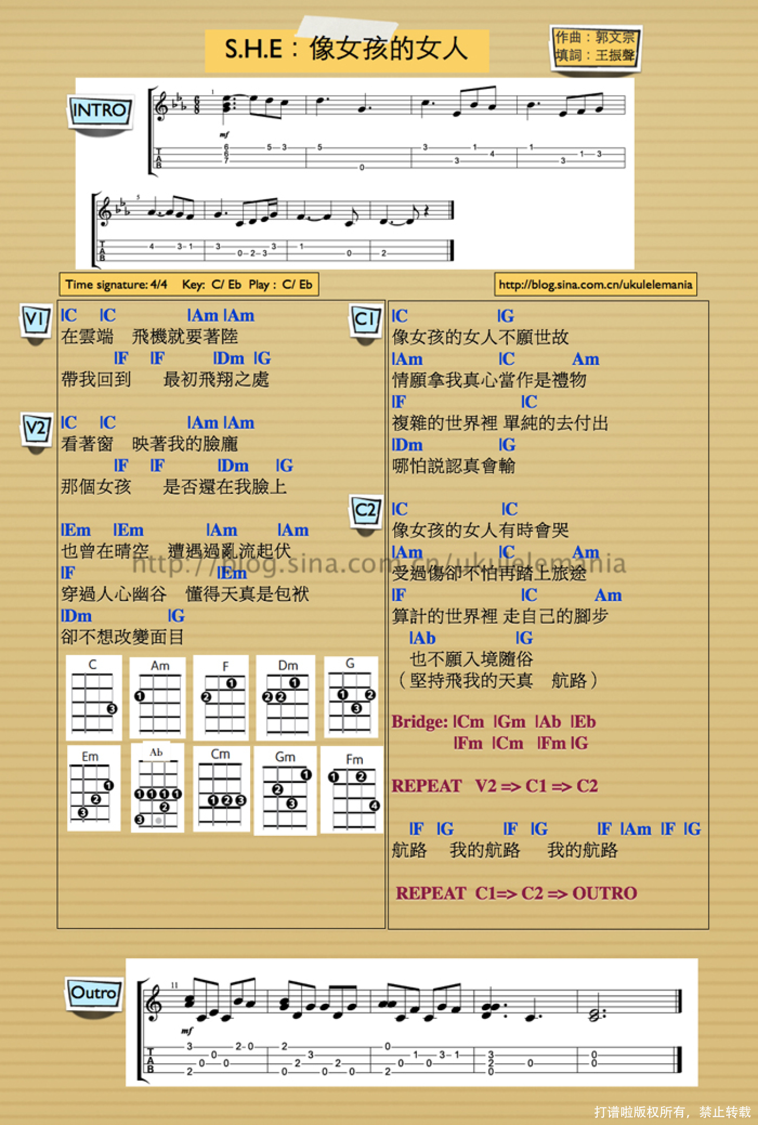曲谱介绍: SHE《像女孩的女人》_C调尤克里里谱