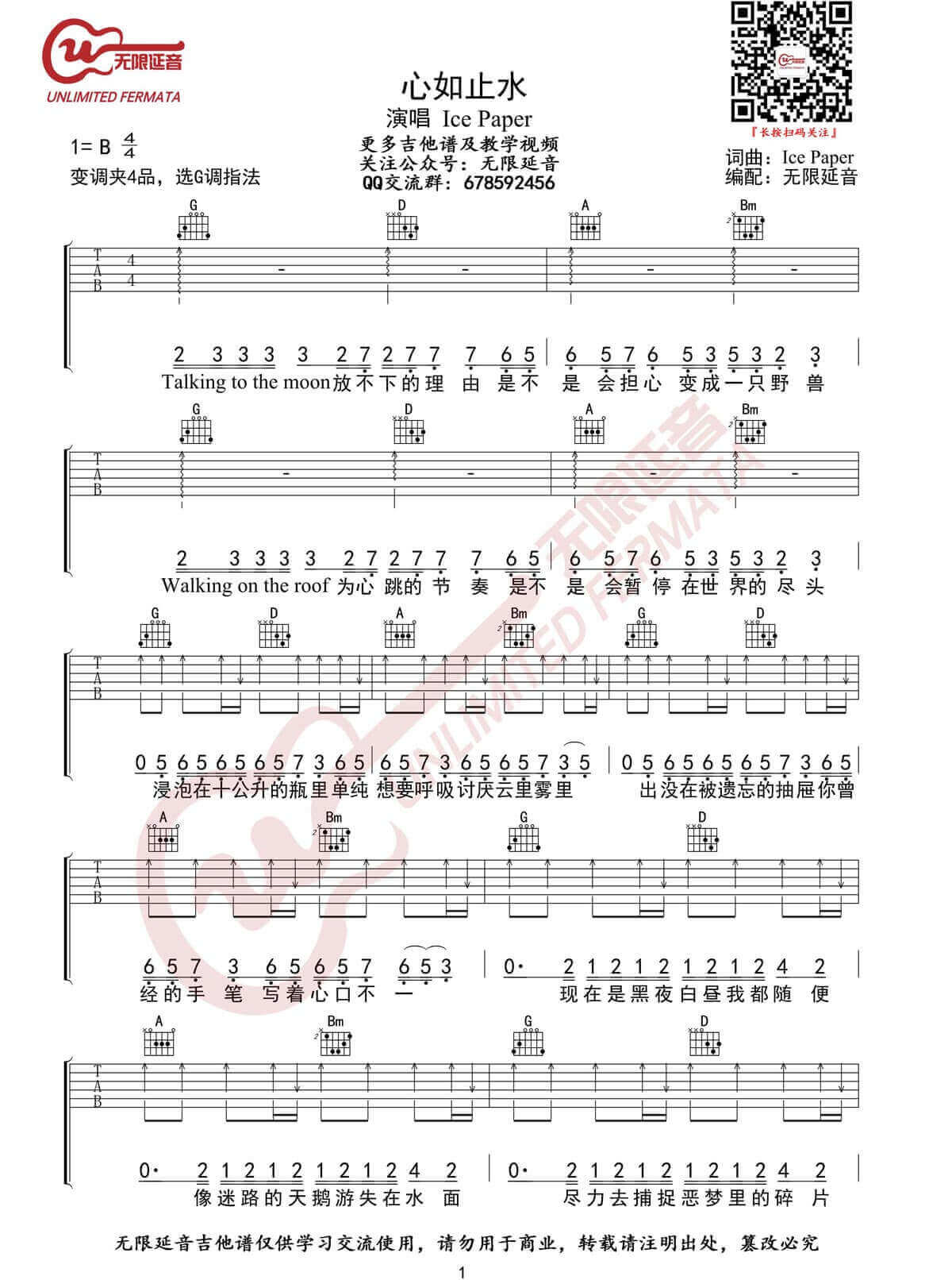 曲谱介绍: 《心如止水》吉他谱_Ice Paper_G调原版弹唱谱_高清六线谱分享,《心如止水》这首歌由Ice Paper作词作曲并演唱,一首最近在某音上非常火的歌曲,旋律很好听,听起来也很带感。 此版本的曲谱来源于无限延音扒谱制谱,歌曲原调为B调,这里采用G调指法根据原版进行编配,演唱时夹变调夹4品即可回到原调,整体难度算是比较简单的,节奏单一,和弦都是循环的。 《心如止水》吉他谱_Ice Paper_G调原版弹唱谱_高清六线谱1: