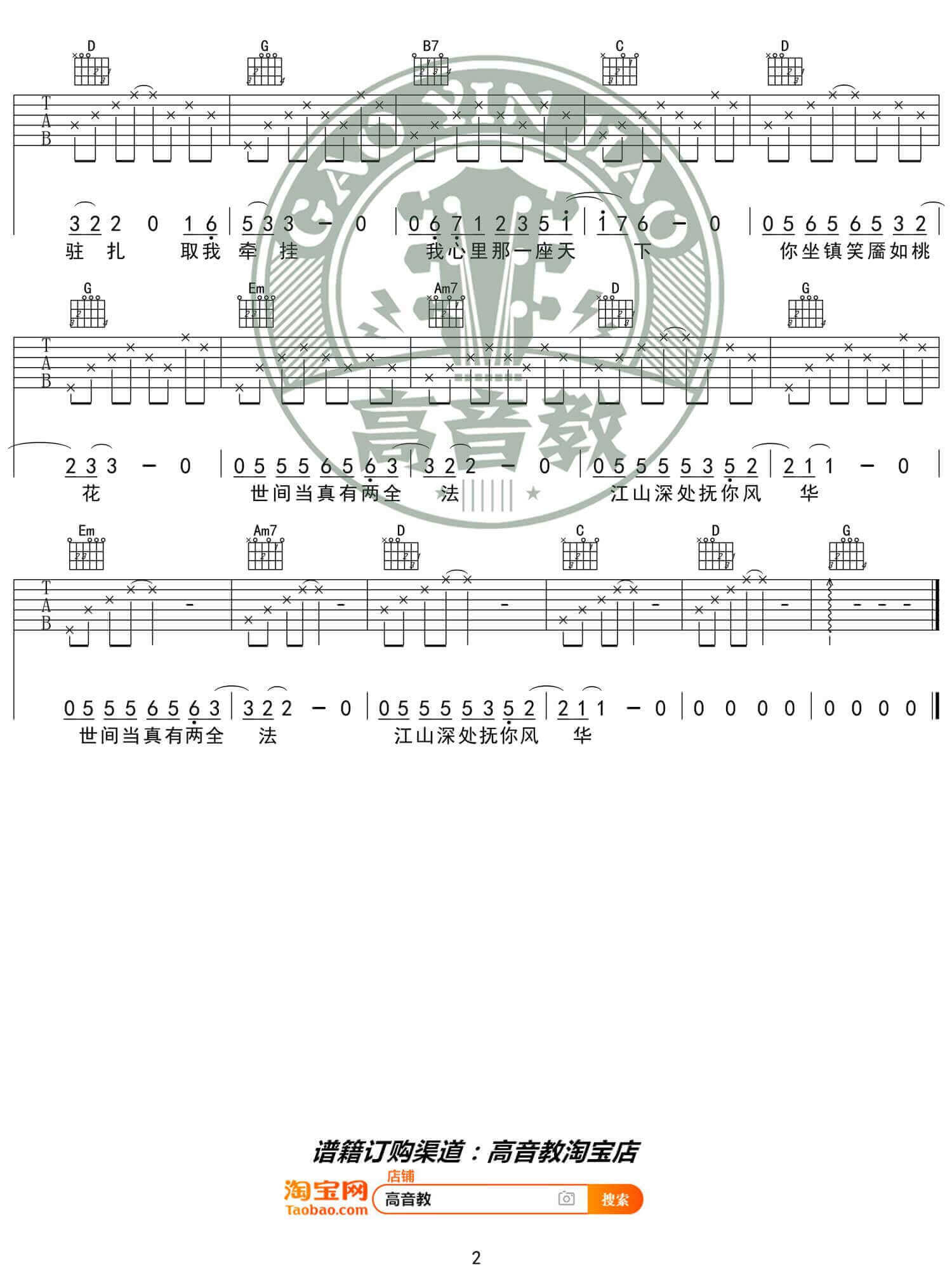 曲谱介绍: 《绝代风华》吉他谱_许嵩_C调简单版弹唱六线谱_高清图片谱分享,《绝代风华》是音乐人许嵩为网易游戏《天下3》十周年庆创作并演唱的歌曲,这首歌中所有的歌词乃至歌名结尾都全部都是押韵的,朗朗上口。 此版本的曲谱来源于高音教扒谱制谱,歌曲原调为降G调,这里采用G调指法编配,演唱时降半音调弦回到原调。全曲共使用了6个和弦,节奏为4/4拍,弹奏时建议拍速为95. 《绝代风华》吉他谱_许嵩_G调简单版弹唱六线谱_高清图片谱1: