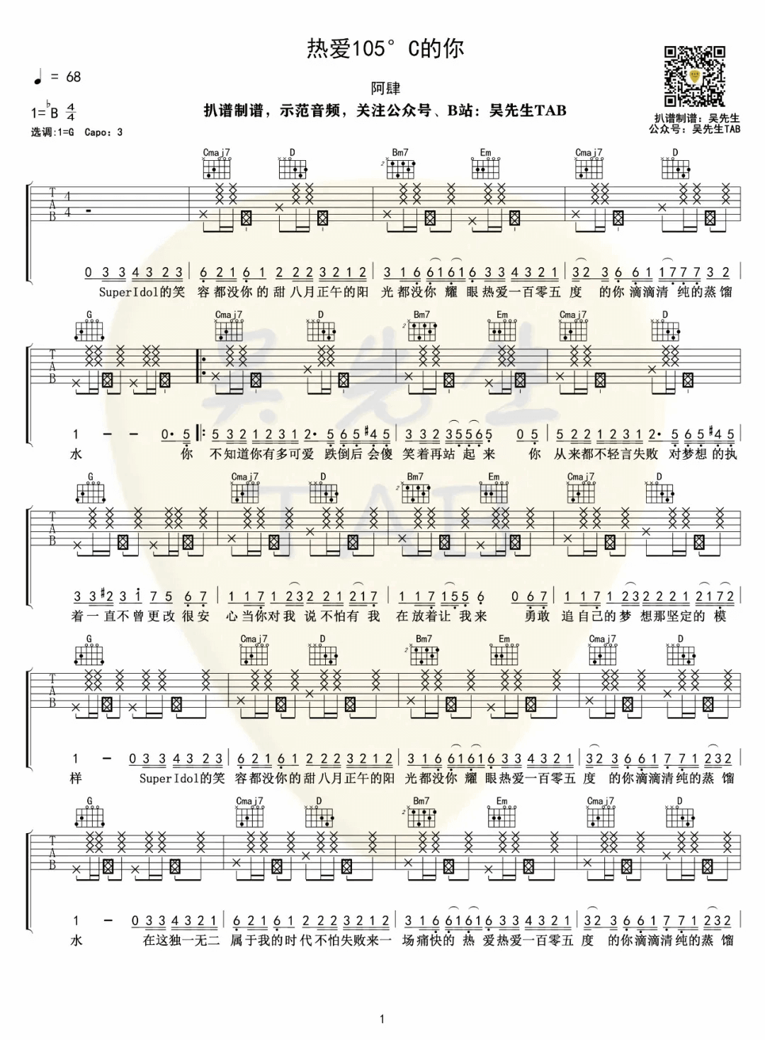曲谱介绍: 《热爱105度的你》吉他谱_阿肆_G调弹唱六线谱_高清图片谱分享,《热爱105度的你》是由阿肆作词作曲并演唱的一首歌曲。整首曲子就是4536451走向,节奏型是制谱人根据个人喜好编配,并非完全按照原版。