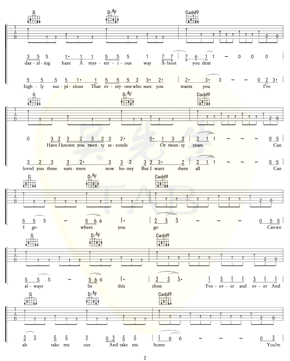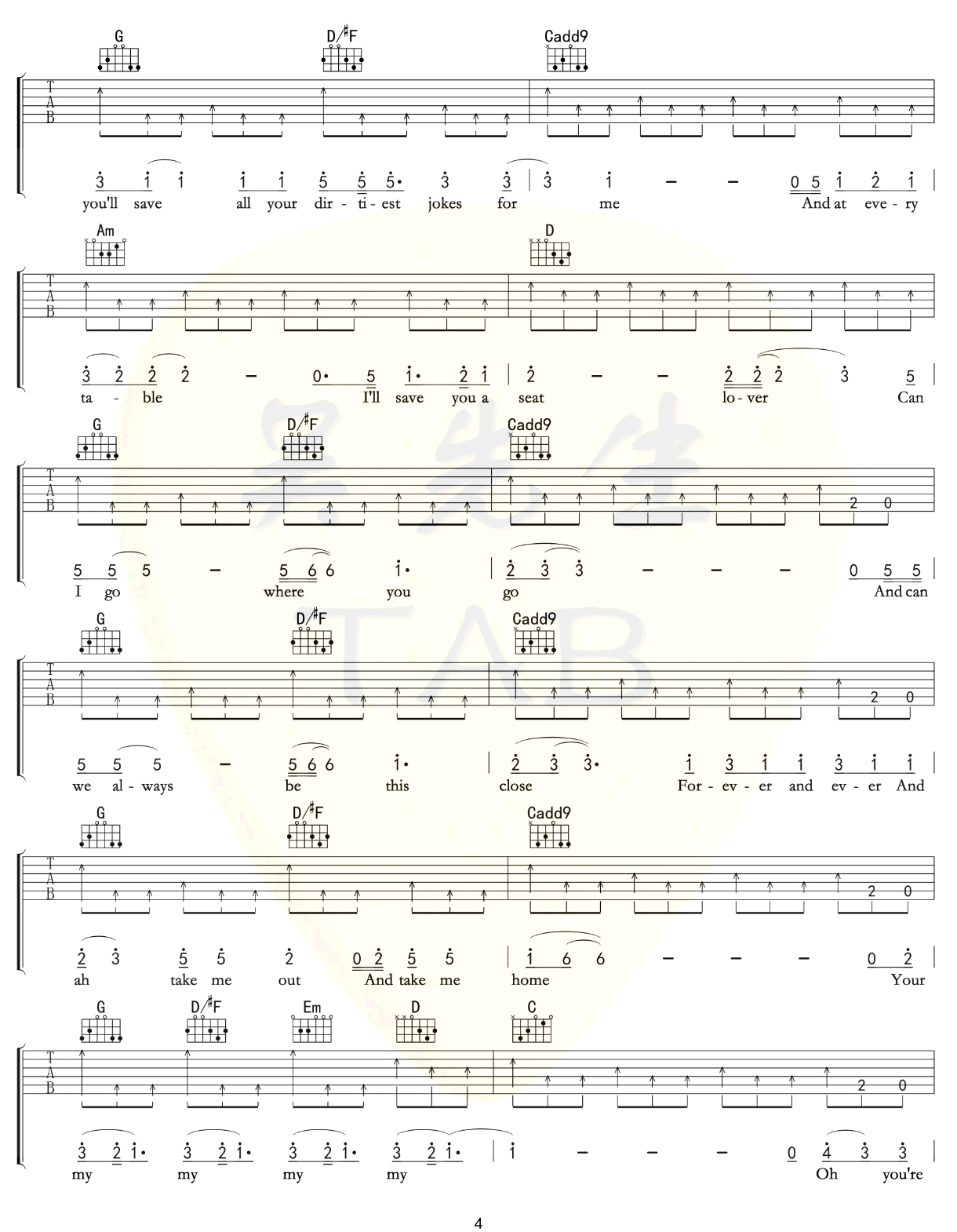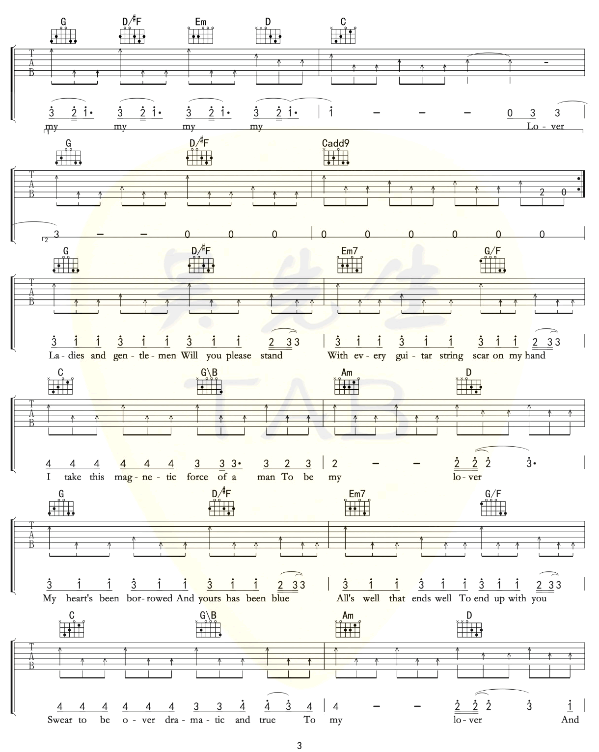 曲谱介绍: 《Lover》吉他谱_Taylor Swift_G调原版弹唱谱_高清六线谱分享,《Lover》是由美国流行女歌手Taylor Swift演唱的一首歌。她本人表示,Lover并不仅仅指爱情,还包含对亲朋好友,乃至对世界的爱,一首好听且非常有格调的一首歌。 此版本的曲谱来源于吴先生扒谱制谱,这里歌曲采用G调指法根据原版进行编配,演唱时根据自己的嗓音情况夹变调夹。这首歌采用全扫弦伴奏,在练习时,一定要注意扫弦的低音和高音部分要分明,不然会非常难听。 《Lover》吉他谱_Taylor Swift_G调原版弹唱谱_高清六线谱1-2: