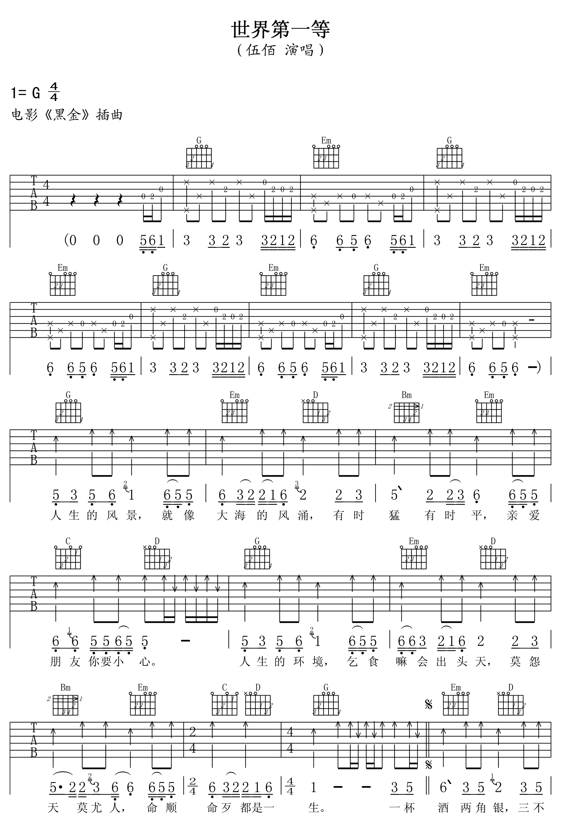 曲谱介绍: 《世界第一等》吉他谱_伍佰/刘德华_G调原版弹唱谱_高清六线谱分享,《世界第一等》是由刘德华演唱的一首闽南语歌曲,伍佰谱曲,该歌曲是电影《黑金》的主题曲,这首励志歌曲告诉我们,人生会经历会时好时坏,会一波三折,这就像大海的浪,时猛时平跌宕起伏,但是只要我们努力平博,都会有成功的那一天。