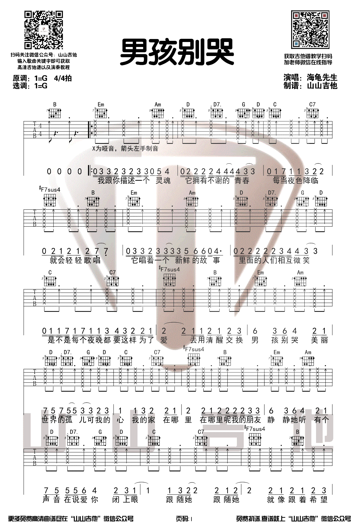 曲谱介绍: 《男孩别哭》吉他谱_欧阳娜娜_G调原版弹唱谱_高清六线谱分享,《男孩别哭》是由海龟先生演唱的一首歌,此版本是由欧阳娜娜在《美好的时光》中翻唱的这首经典的摇滚歌曲。这首歌采用G调指法根据原版进行编配,和弦及右手技巧都有点难度,得花多点时间练习。 吉他弹唱演示及视频教学