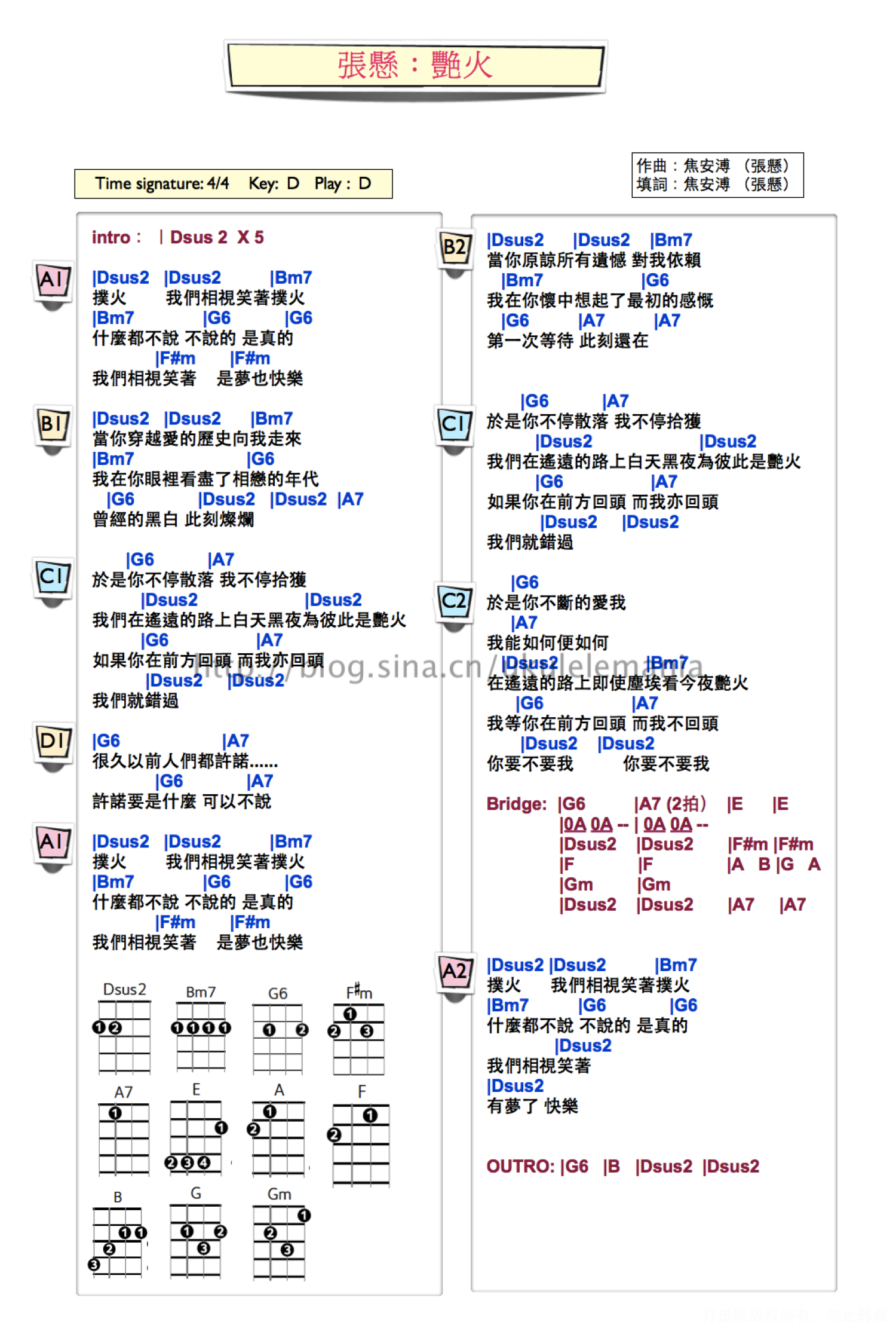曲谱介绍: 张悬的清新民谣带点轻摇滚的风格很不错,词的文学性很高,不愧是才女。很有很有特色。下面这首艳火希望大家在弹奏过程中细细欣赏,细细感受。作者:阿fa艳火尤克里里谱:右手扫弦建议:或者把这个节奏再简化一下也行的,具体参考下面视频。视频参考:之前有发过张悬的另外一首歌《玫瑰色的你尤克里里谱》,喜欢的可传送过去。