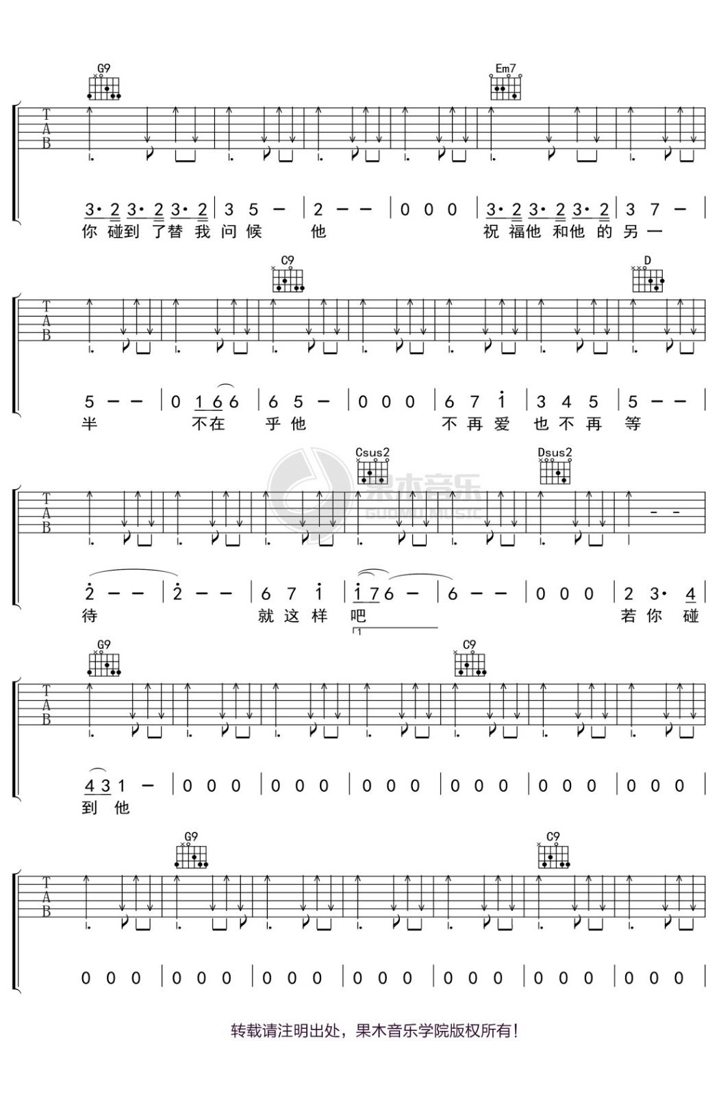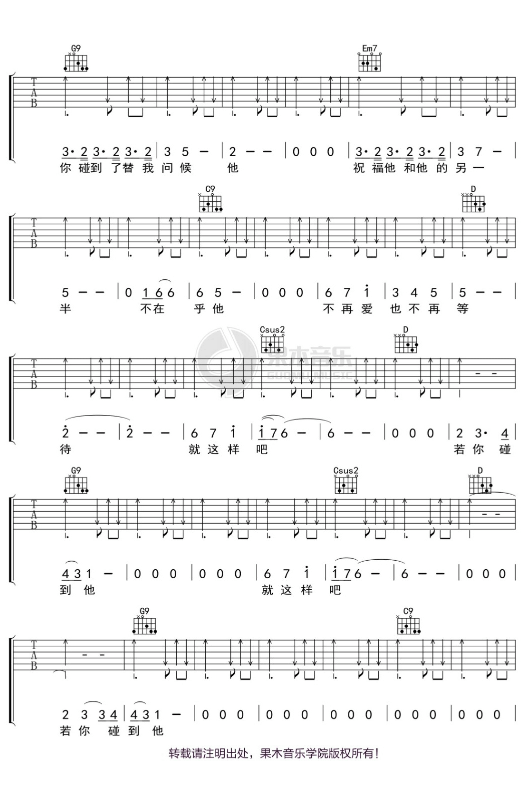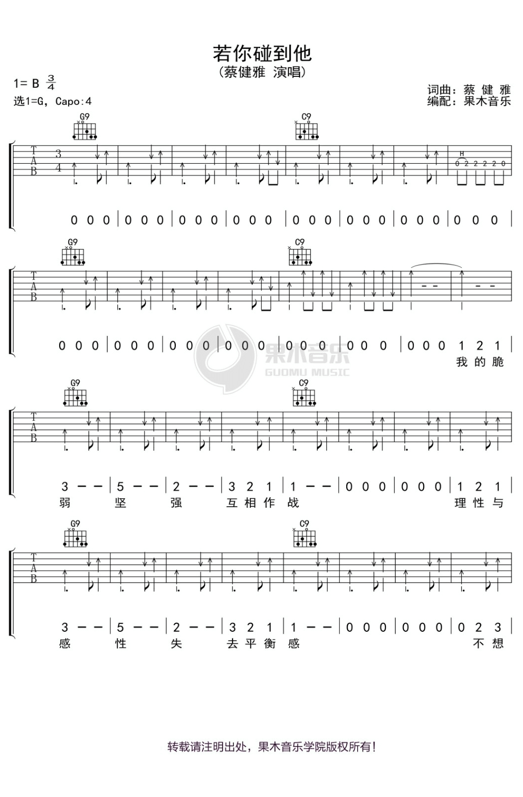 曲谱介绍: 《若你碰到他》吉他谱_蔡健雅_G调原版弹唱谱_高清六线谱分享,《若你碰到他》是由蔡健雅创作并演唱的一首歌,在这首歌中蔡健雅突破以往的歌词表现,以犀利敏锐的文字透视每个人心中最放不下的那段记忆。旋律并不算流畅,起伏的幅度不大,但是层次感非常强,表面平静内心暗涌的感情层层推进,达致最高点,然后再淡淡地收起。偶而几句的尾音稍微挑高一些,旋即又回到平实的旋律走向上,给人很高的听觉舒适度。