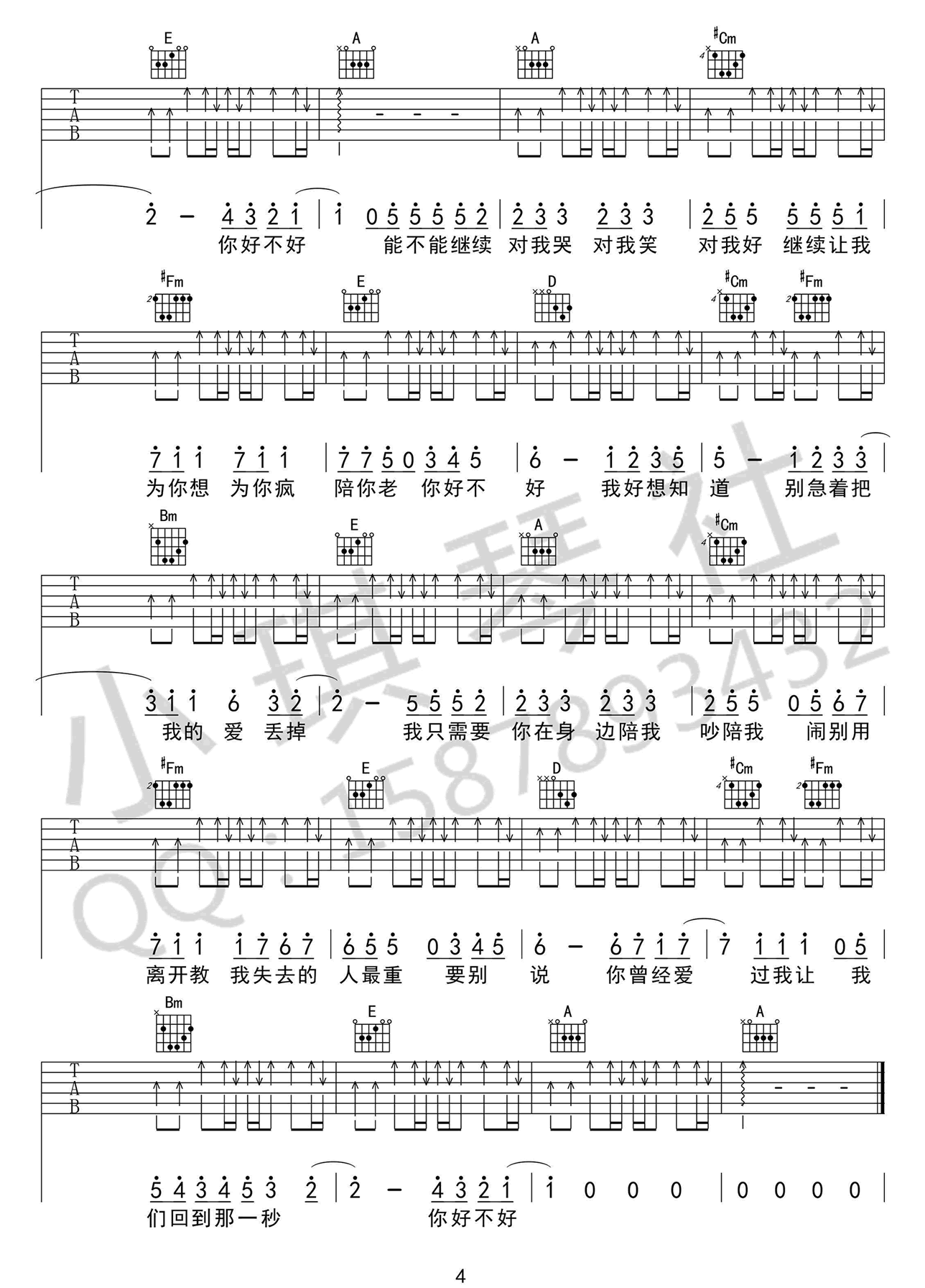 曲谱介绍: 《你好不好》吉他谱_周兴哲/艾辰_A调简单版弹唱谱_高清六线谱分享,《你好不好》这首歌由周兴哲演唱。周兴哲一次带着自己的爱犬在公园散步时,面对一片绿地与阳光,脑中闪过一段副歌旋律,他赶紧用手机录下,回家后便开始构思旋律。 此版本的曲谱来源于小琪琴社扒谱制谱,歌曲原调为#A调,这里采用A调指法根据原版进行编配,演唱时夹变调夹1品回到原调。曲谱编配节奏倒不是很难,但和弦中存在较多大横按,可能对新手有点难度。 《你好不好》吉他谱_周兴哲/艾辰_A调原版弹唱谱_高清六线谱1-2:
