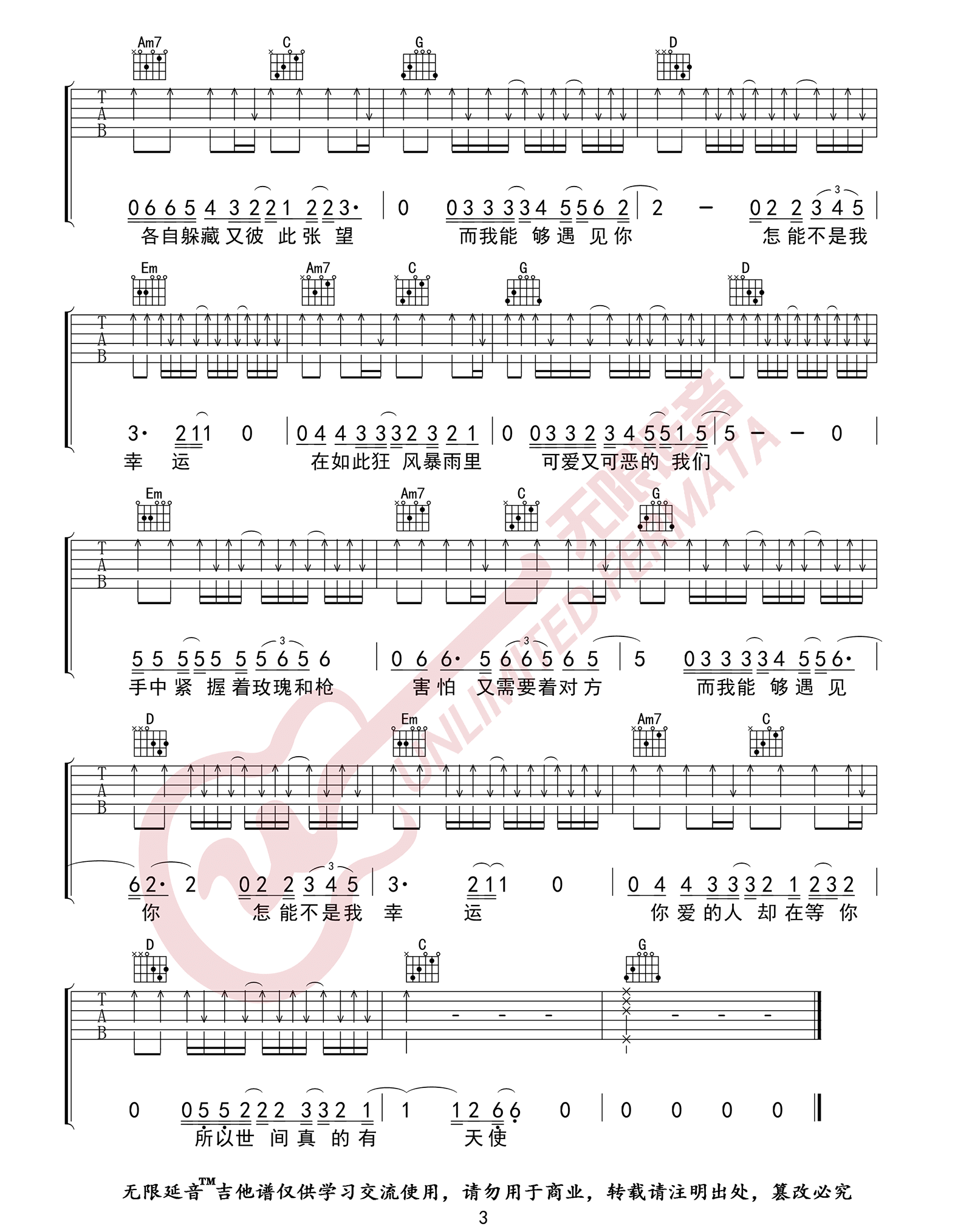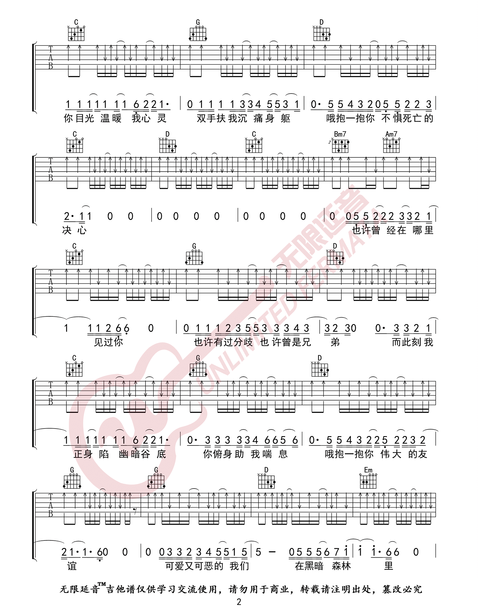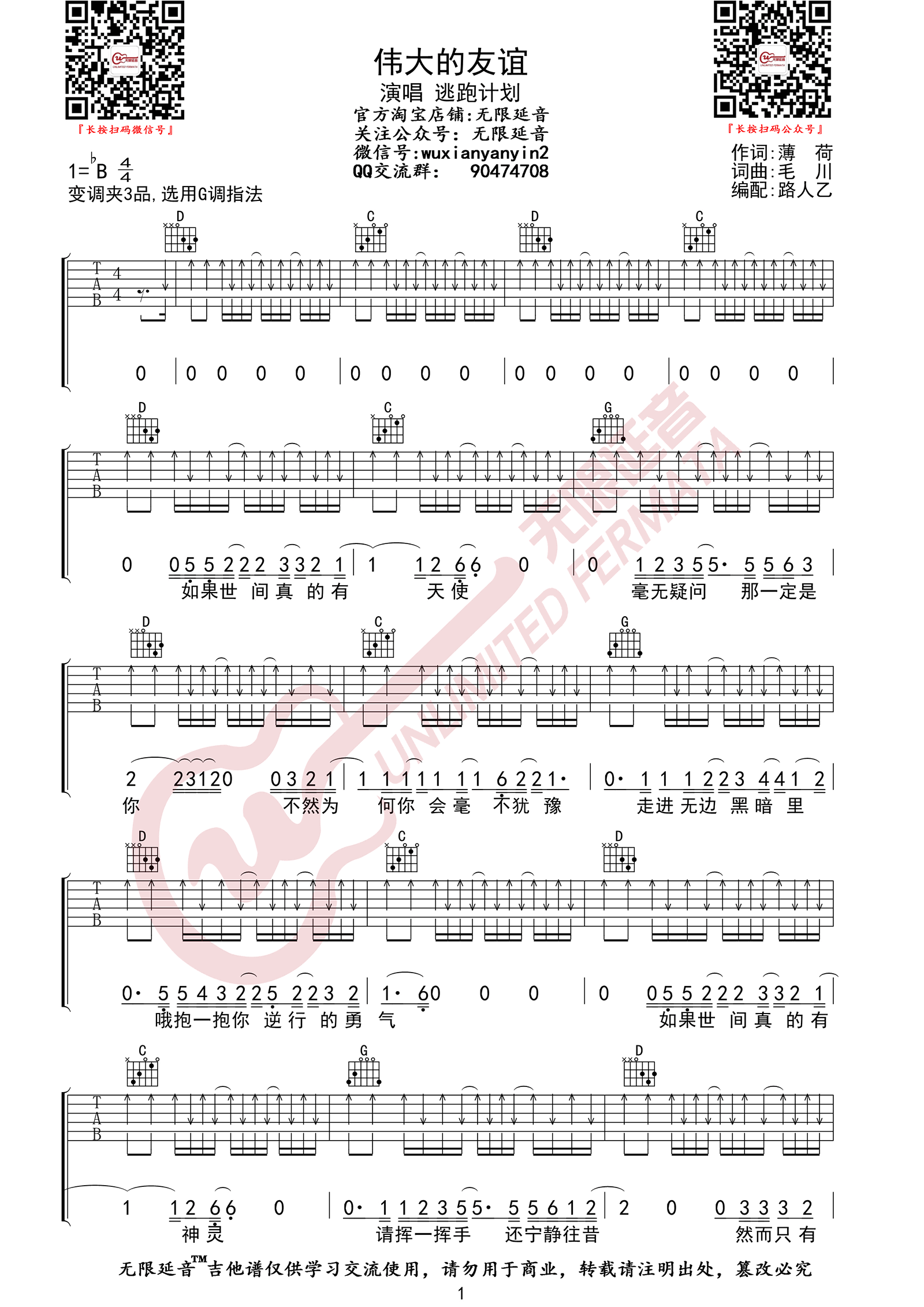 曲谱介绍: 《伟大的友谊》吉他谱_逃跑计划_G调原版弹唱谱_高清六线谱分享,《伟大的友谊》是由逃跑计划创作并演唱的一首歌。我们素昧平生,却被拯救于幽暗谷底。我们来自各行各地,却在灾难面前结下遥远又深厚的友谊。谢谢你们在他人最需要的时候伸出仁爱与关怀的友谊之手。 此版本的曲谱来源于无限延音扒谱制谱,歌曲原调为降B调,这里采用了G调指法根据原版进行编配,演唱时夹变调夹3品回到原调。这首歌编配难度不大,全曲都采用了扫弦的形式进行编配,使用的和弦及节奏型都十分简单,比较容易练习。 《伟大的友谊》吉他谱_逃跑计划_G调原版弹唱谱_高清六线谱1: