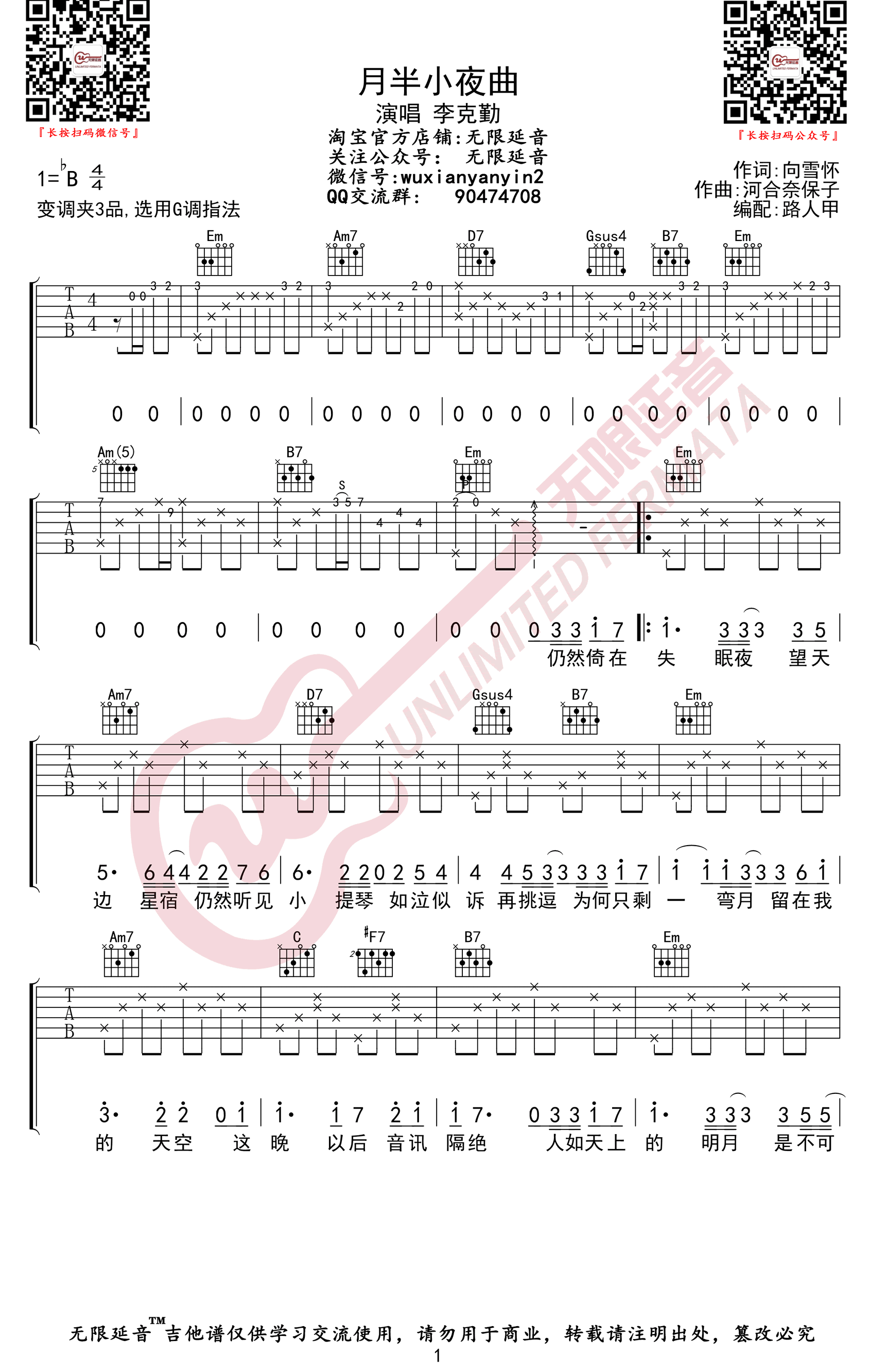 曲谱介绍: 《月半小夜曲》吉他谱_李克勤_G调原版弹唱六线谱_高清图片谱分享,《月半小夜曲》是由李克勤演唱的一首经典粤语歌曲,这是一首感怀伤情的悲歌,但是相比较其他的情歌显得比较有力量一点。曾经如此相爱的两个人,因为女方的不辞而别,“这晚夜没有吻别”,可以看出男方对这段感情的重视,无奈和惋惜。