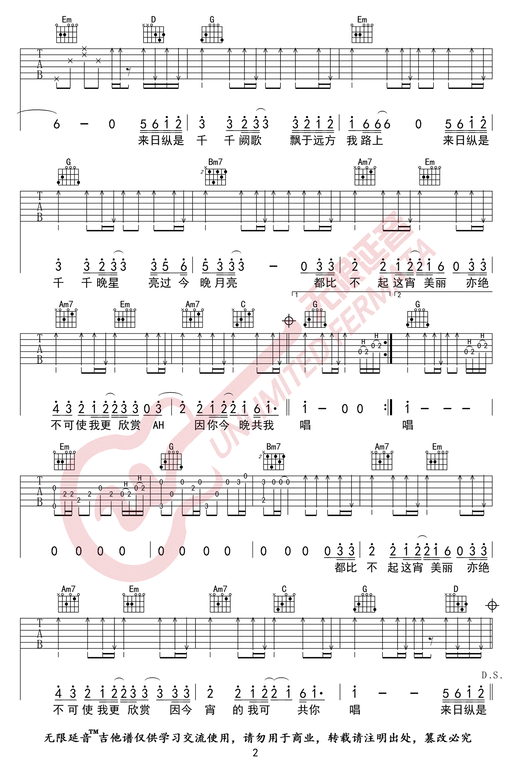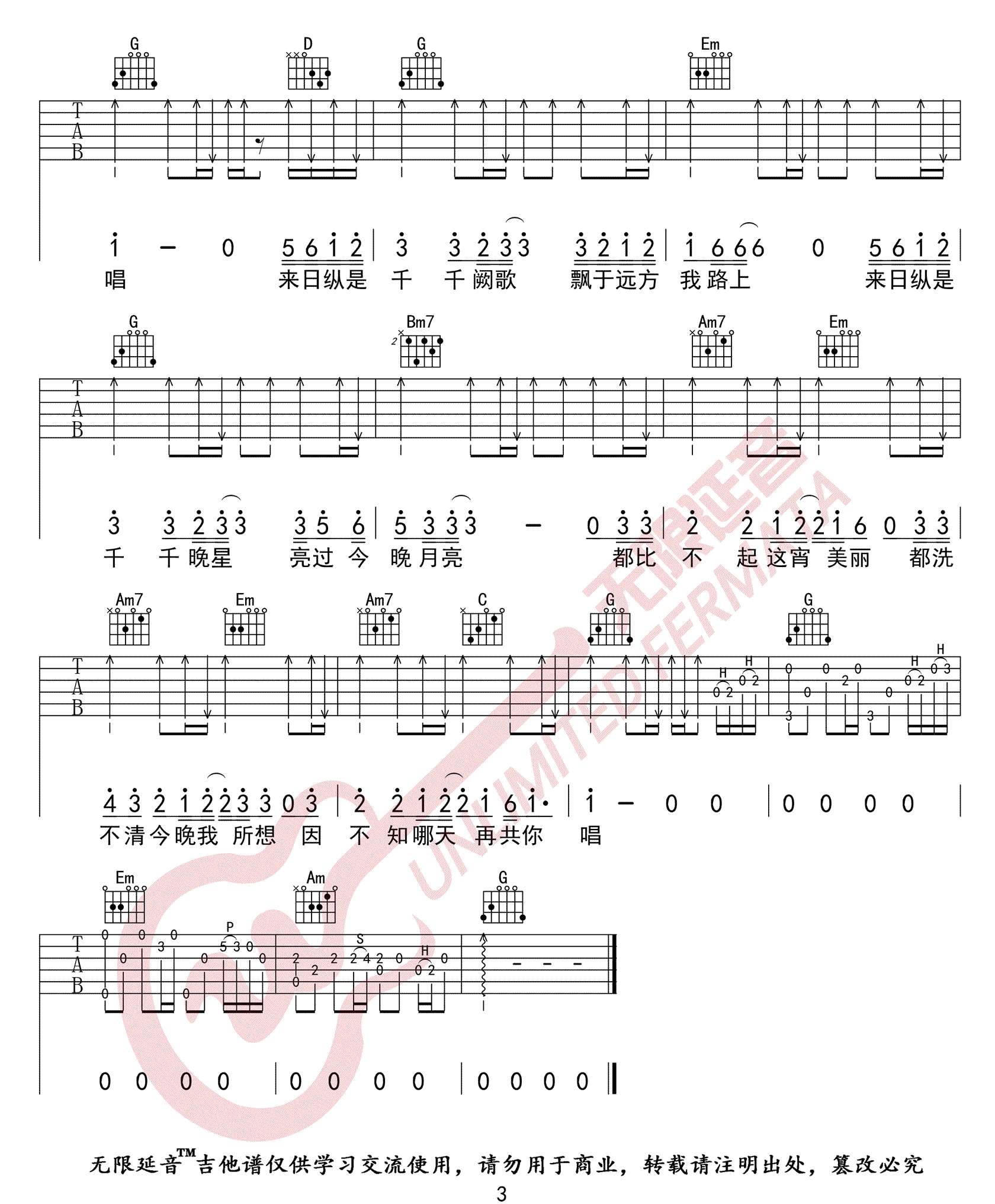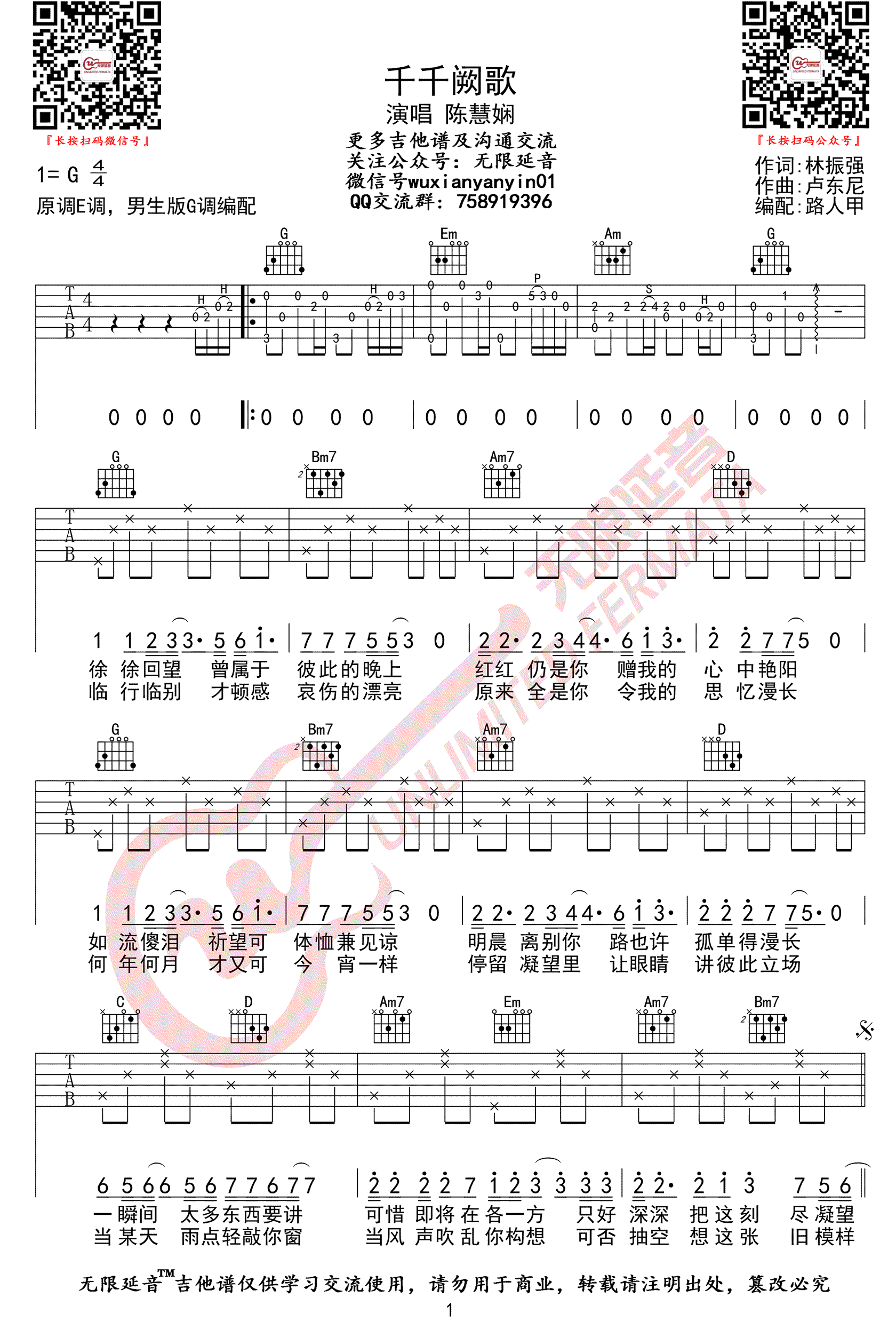 曲谱介绍: 《千千阙歌》吉他谱_陈慧娴_G调男生版弹唱谱_高清六线谱分享,《千千阙歌》是由陈慧娴演唱的一首经典粤语歌曲,这首歌多年来被众多歌手及网友翻唱,有过很多的翻唱版本,是在是一首不可多得的经典粤语金曲之一了。 此版本的曲谱来源于无线延音扒谱制谱,歌曲原调为E调,这里采用G调指法进行编配,比较适合男生的嗓音来演唱,当然女生要唱也可以选择合适的变调夹品位。歌曲编配难度其实并不大,前奏和尾奏很好的还原了歌曲的旋律,节奏型及和弦都还比较简单。 《千千阙歌》吉他谱_陈慧娴_G调男生版弹唱谱_高清六线谱1: