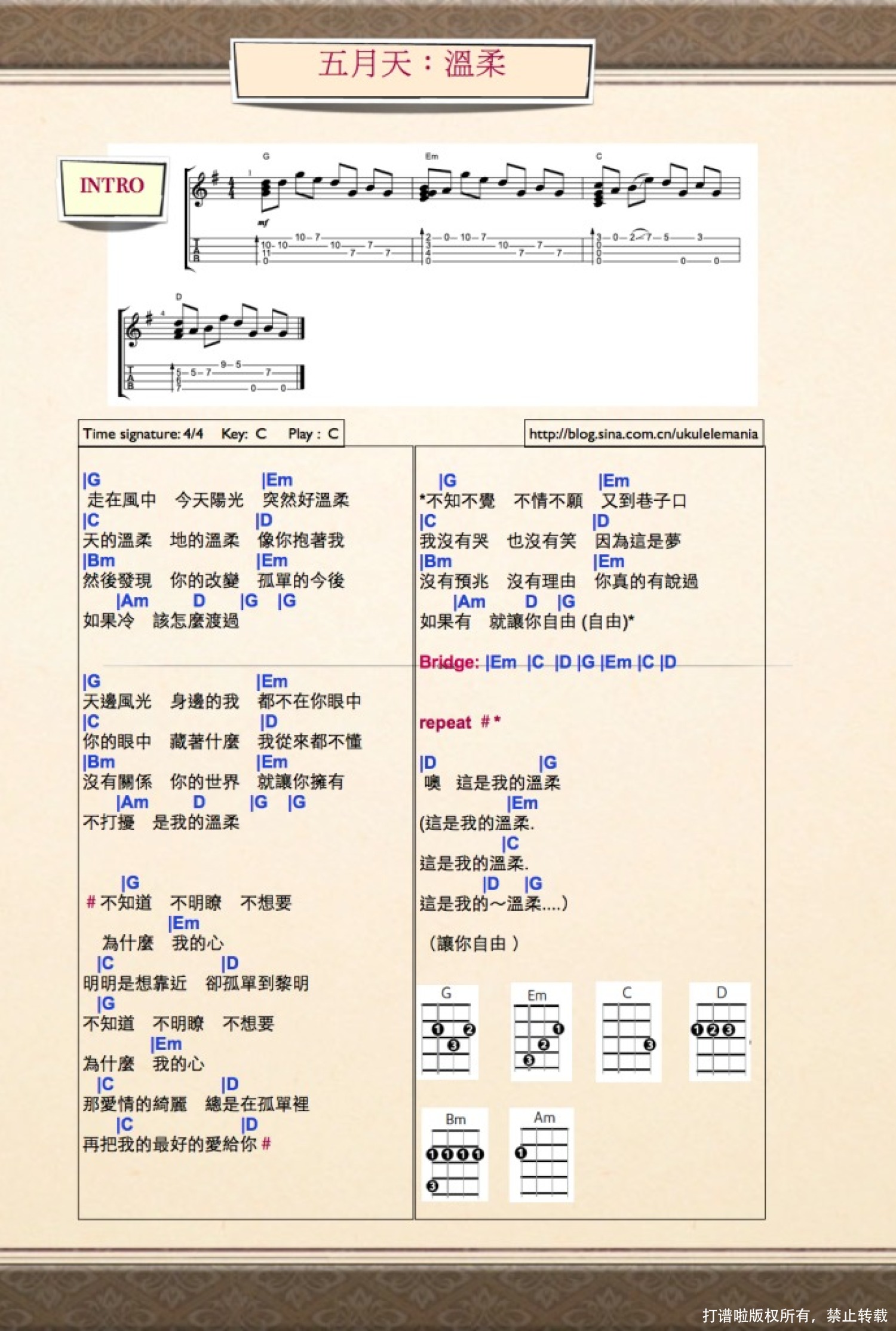曲谱介绍: 五月天《温柔》_G调尤克里里谱