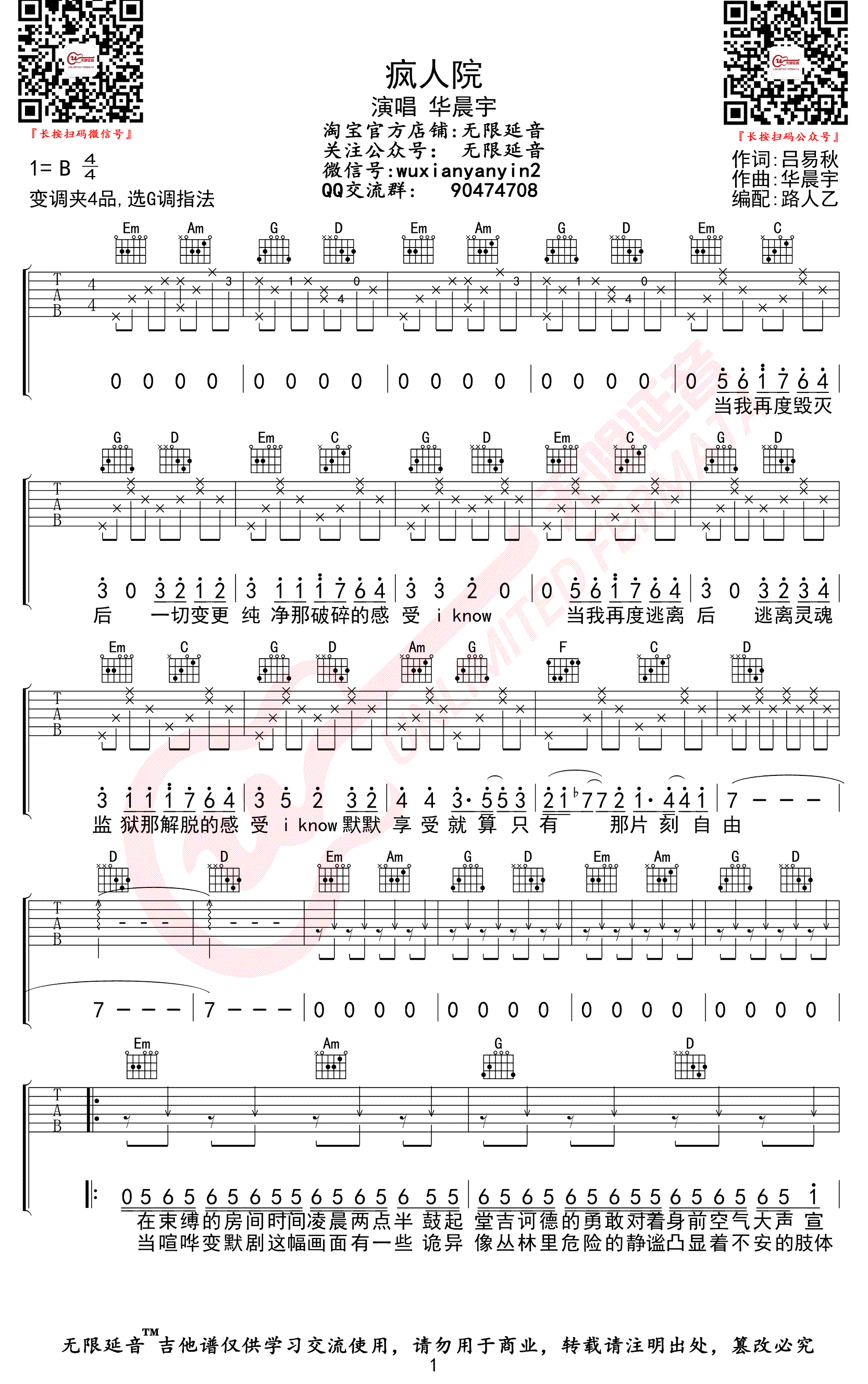 疯人院吉他谱 - 华晨宇 - G调吉他弹唱谱