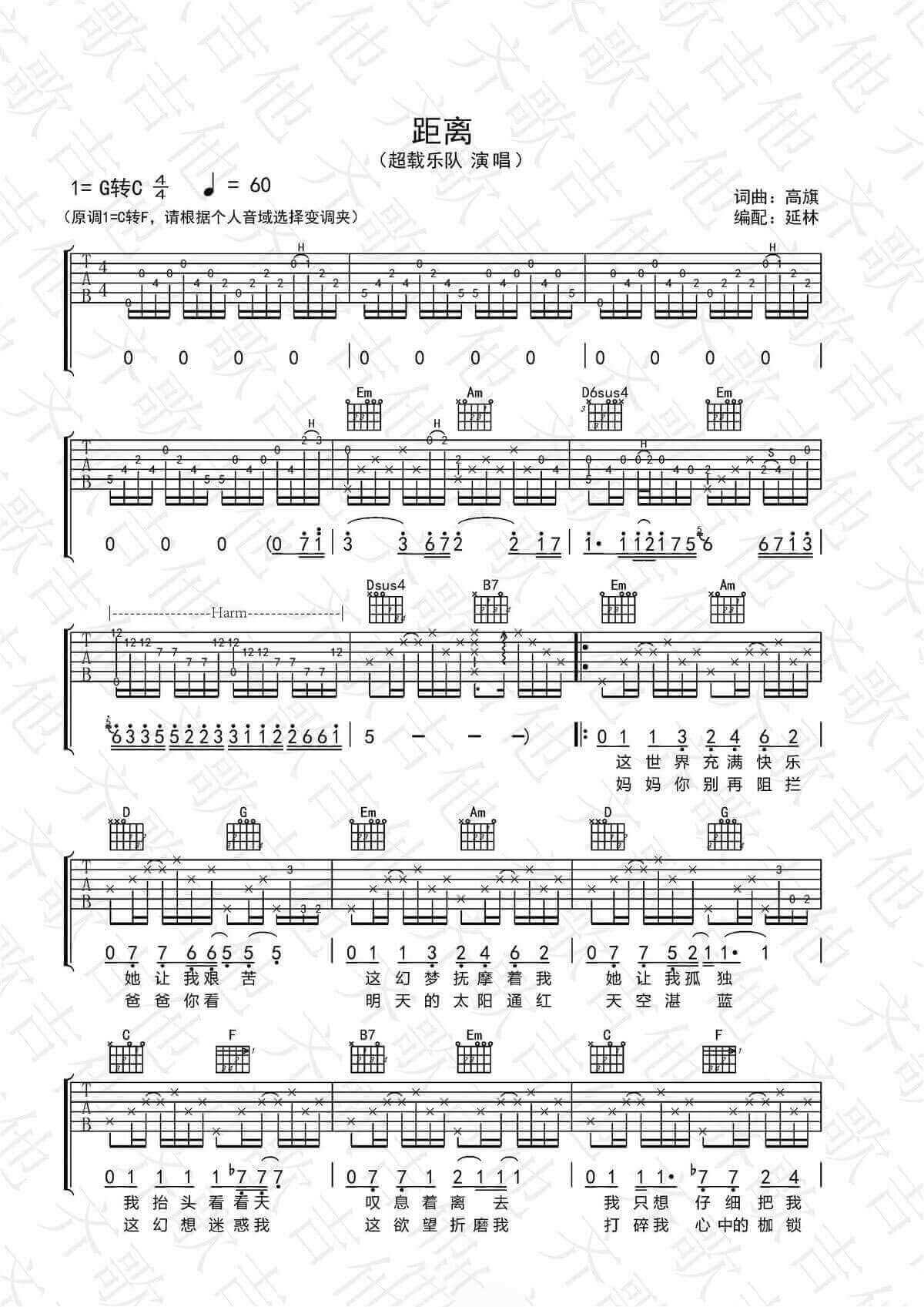 曲谱介绍: 距离吉他谱_超载乐队_《距离》G调原版弹唱谱_高清六线谱分享,《距离》是由超载乐队创作并演唱的一首经典摇滚歌曲,这首歌,有段时间感觉这是一个近完美的作品,几乎变态的去听。