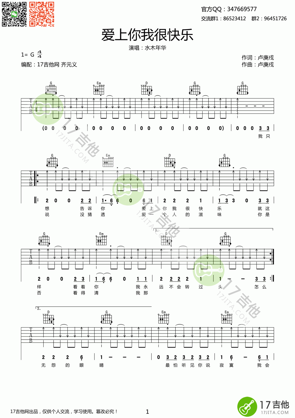 曲谱介绍: 水木年华《爱上你我很快了》吉他弹唱谱,采用G调指法编配,共有2张高清图谱,免翻页排版设计。