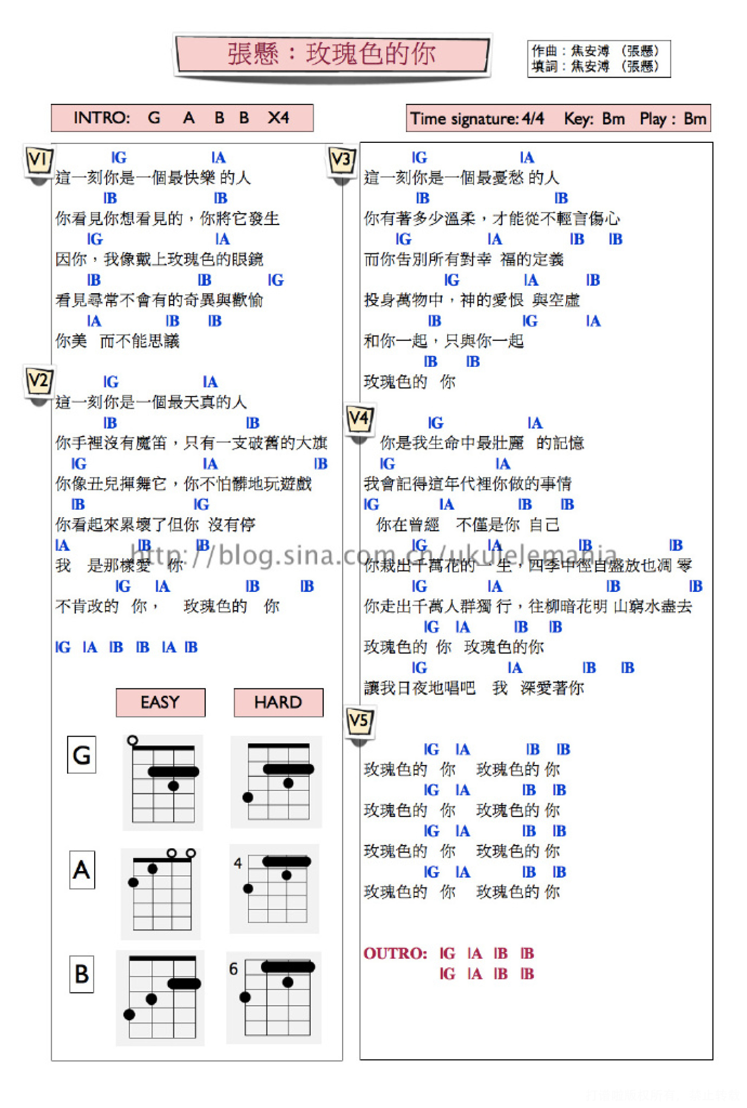 曲谱介绍: 张悬《玫瑰色的你》_G调尤克里里谱