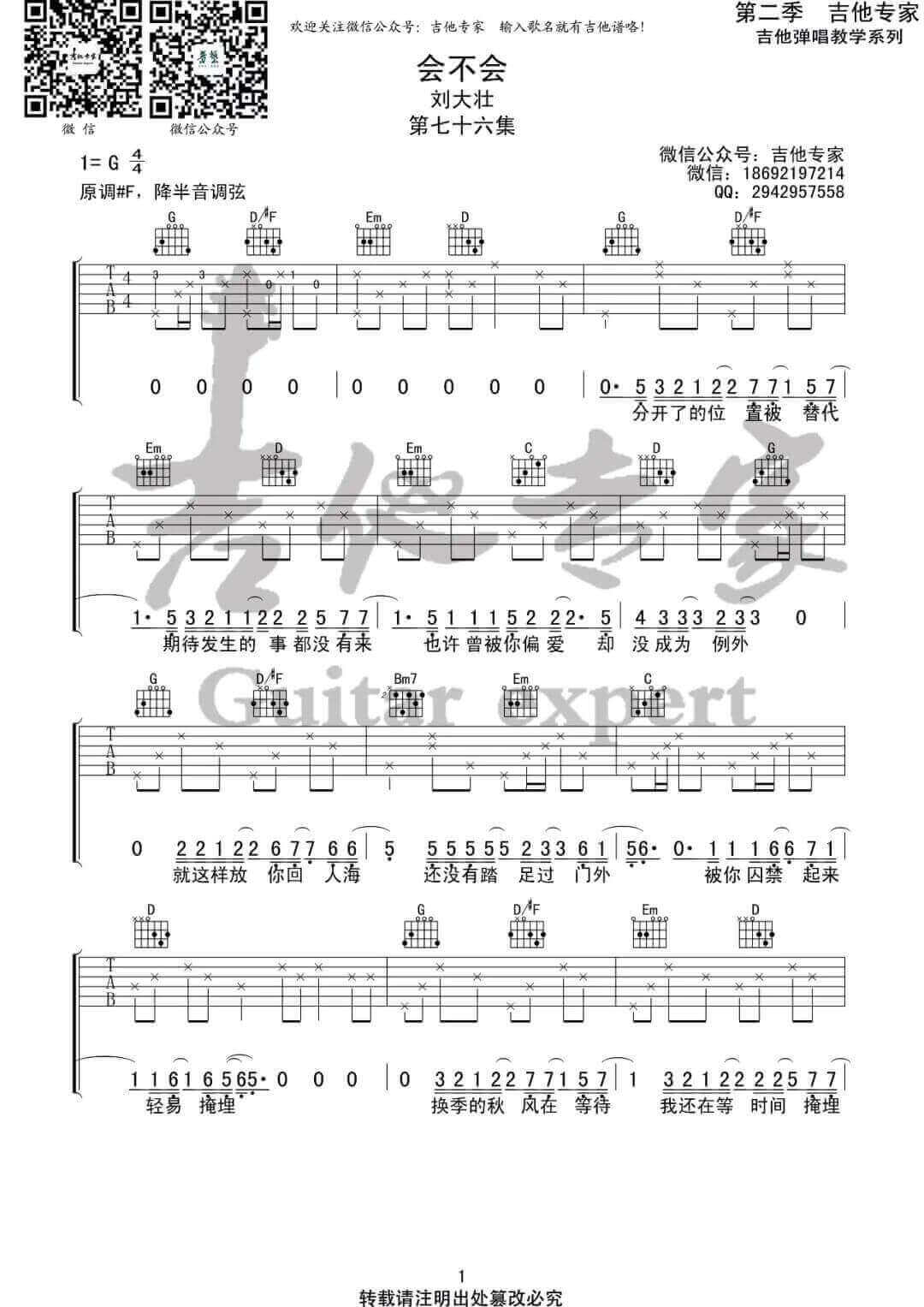 会不会吉他谱 - 刘大壮 - G调吉他弹唱谱 - 原版