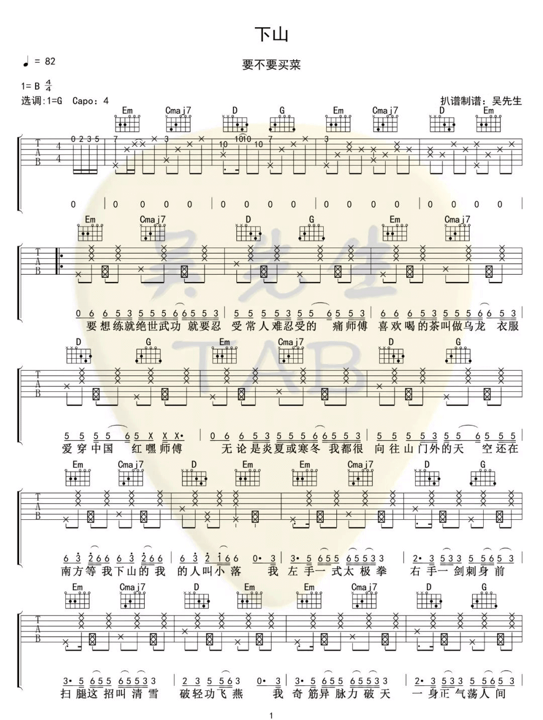 曲谱介绍: 下山吉他谱_要不要买菜_《下山》G调原版弹唱六线谱_高清图片谱分享,《下山》是由“要不要买菜”演唱的一首歌,这个艺名有点…不过歌曲还是比较好听的,一首听起来非常有味道的古风类歌曲,最近网络上非常火。 此版本的曲谱来源于吴先生扒谱制谱,歌曲原调为B调,这里采用了G调指法根据原版进行编配,演唱时夹变调夹4品回到原调。这首歌前奏编配把位跨度较大,曲中多处带有一些旋律音,另外加入了拍弦技巧,有一定难度。 下山吉他谱_要不要买菜_《下山》G调原版弹唱六线谱_高清图片谱1: