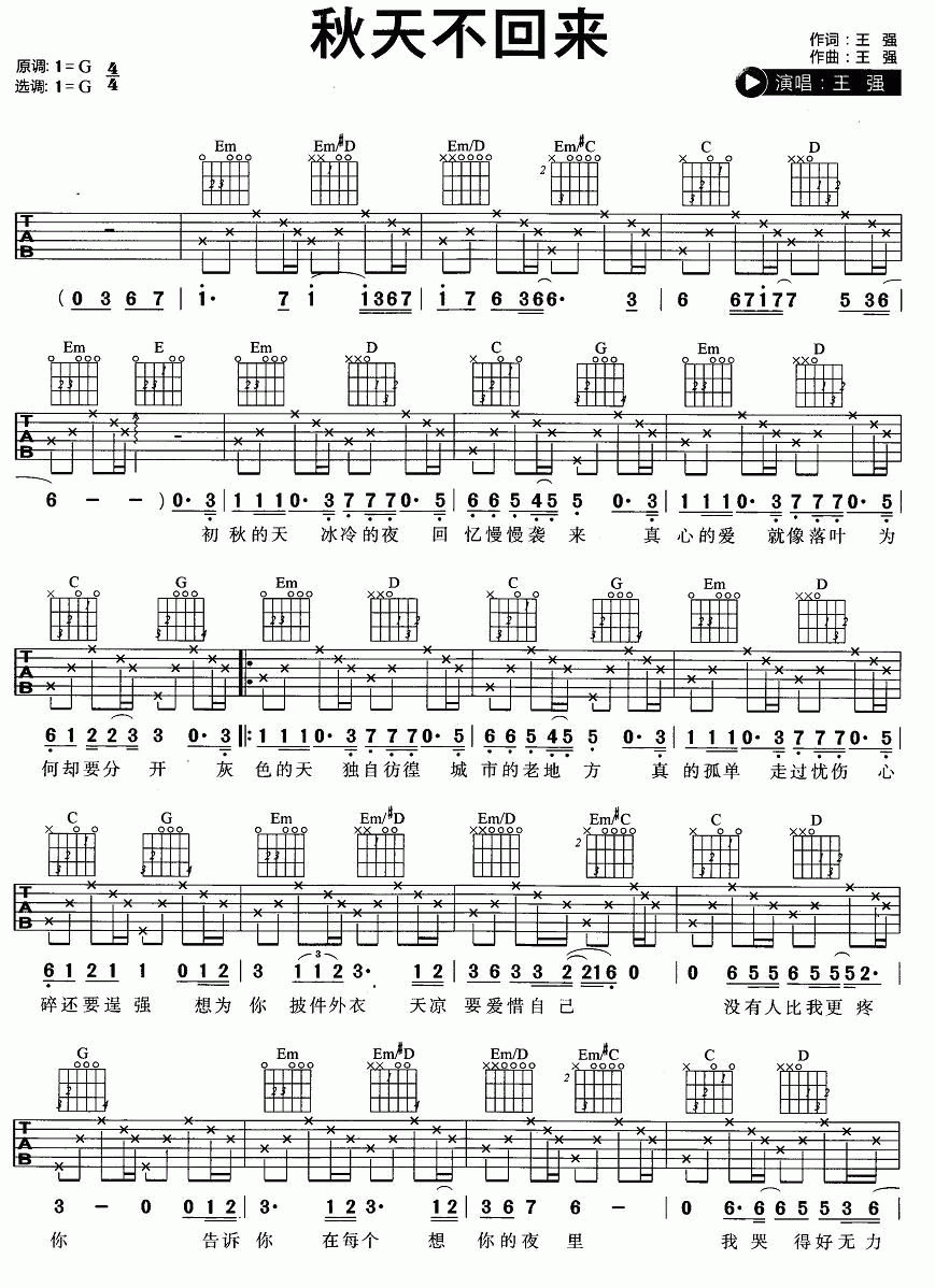 秋天不回来吉他谱 - 王强 - G调吉他弹唱谱