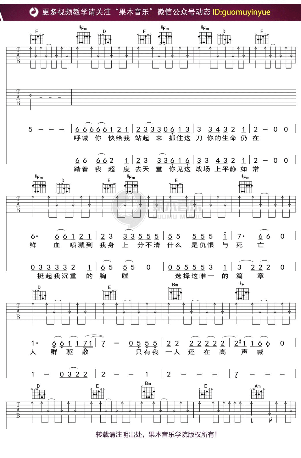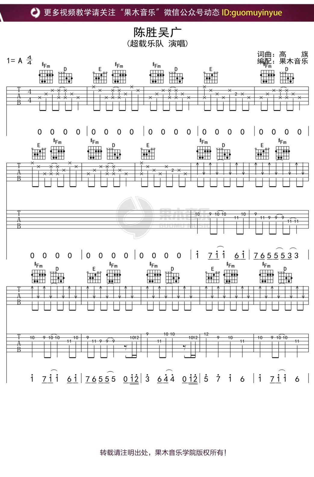 曲谱介绍: 《陈胜吴广》吉他谱_超载乐队_A调弹唱六线谱_高清图片谱分享,《陈胜吴广》是由超载乐队演唱的一首歌,这首歌在金属音乐坚实的外衣下潜藏了生命深处的愤争,它通过音乐的跌宕起伏将这种情绪弥漫扩散到各个角落。这种带有悲剧色彩的人生观,在高旗诗一般的文字和寓意丰富的意象中透彻地表现出来,将摇滚乐所要表达的那种深刻性和真实性一览无遗。