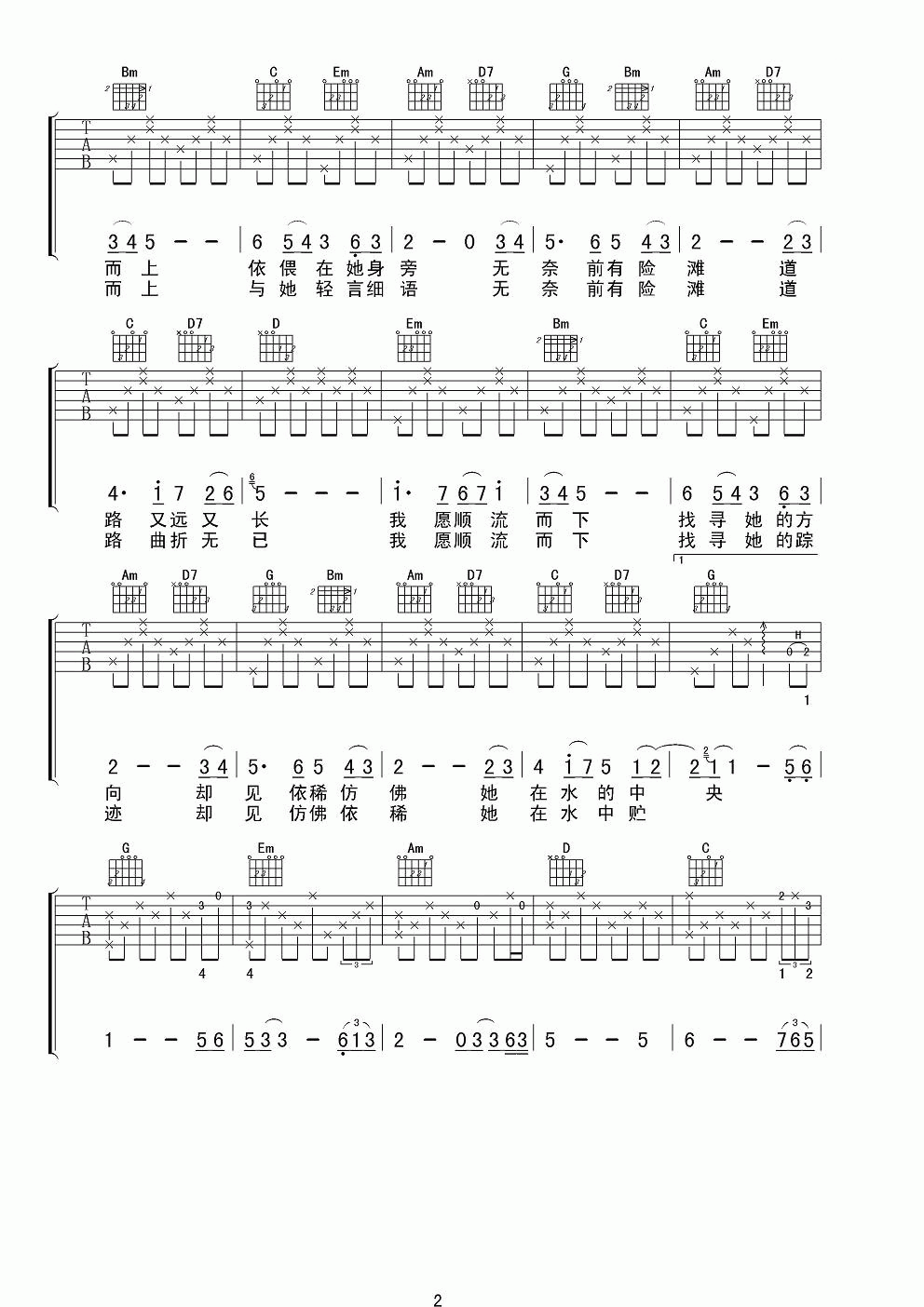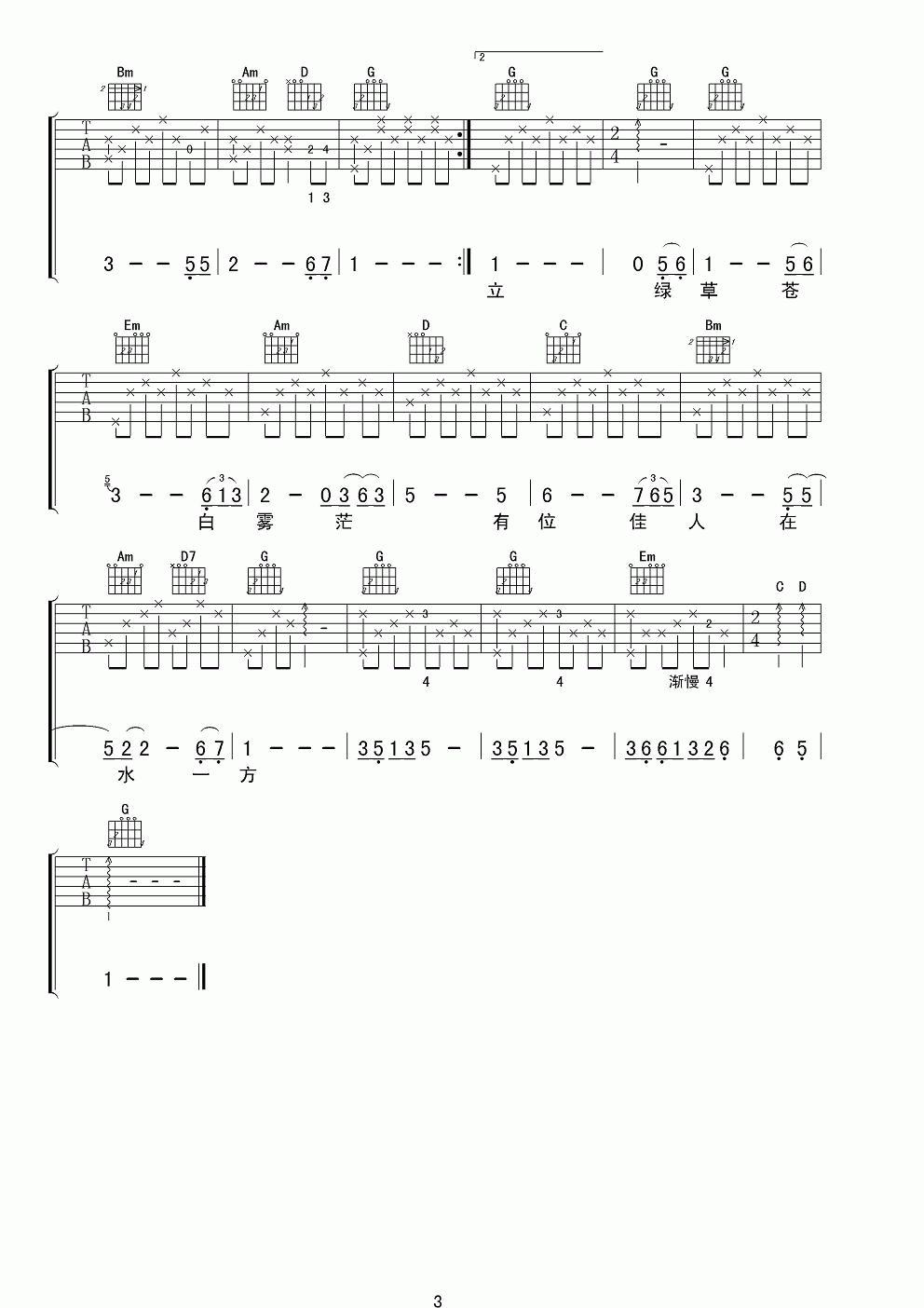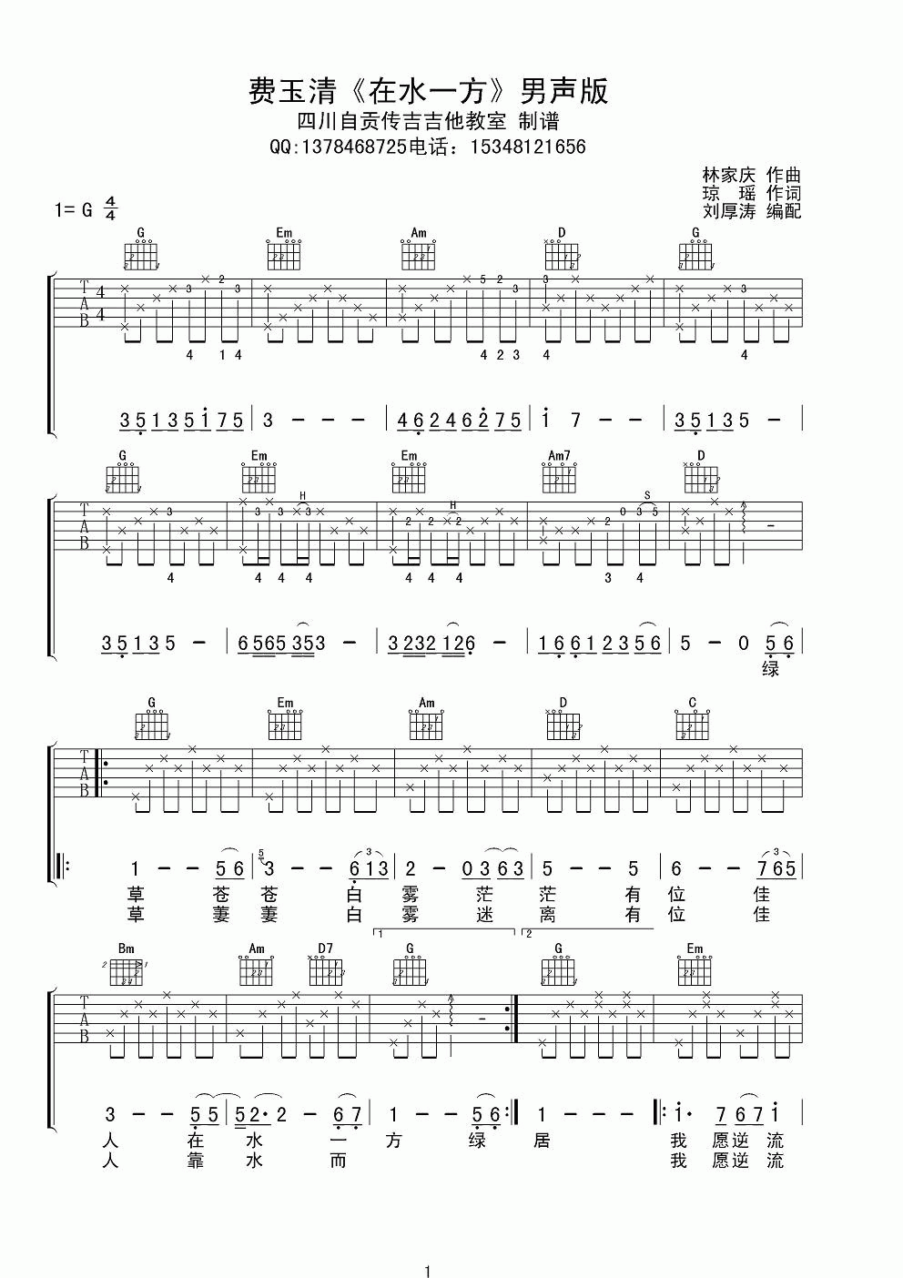 曲谱介绍: 费玉清《在水一方》吉他弹唱谱,采用G调指法编配,共有3张高清图谱。